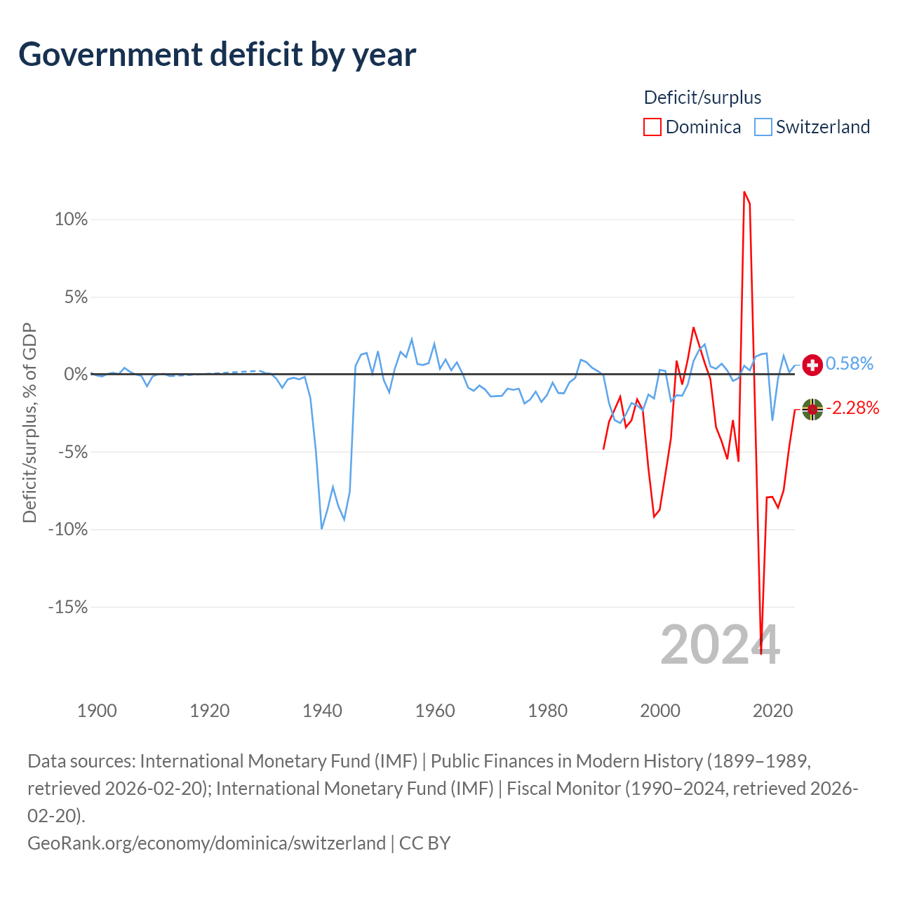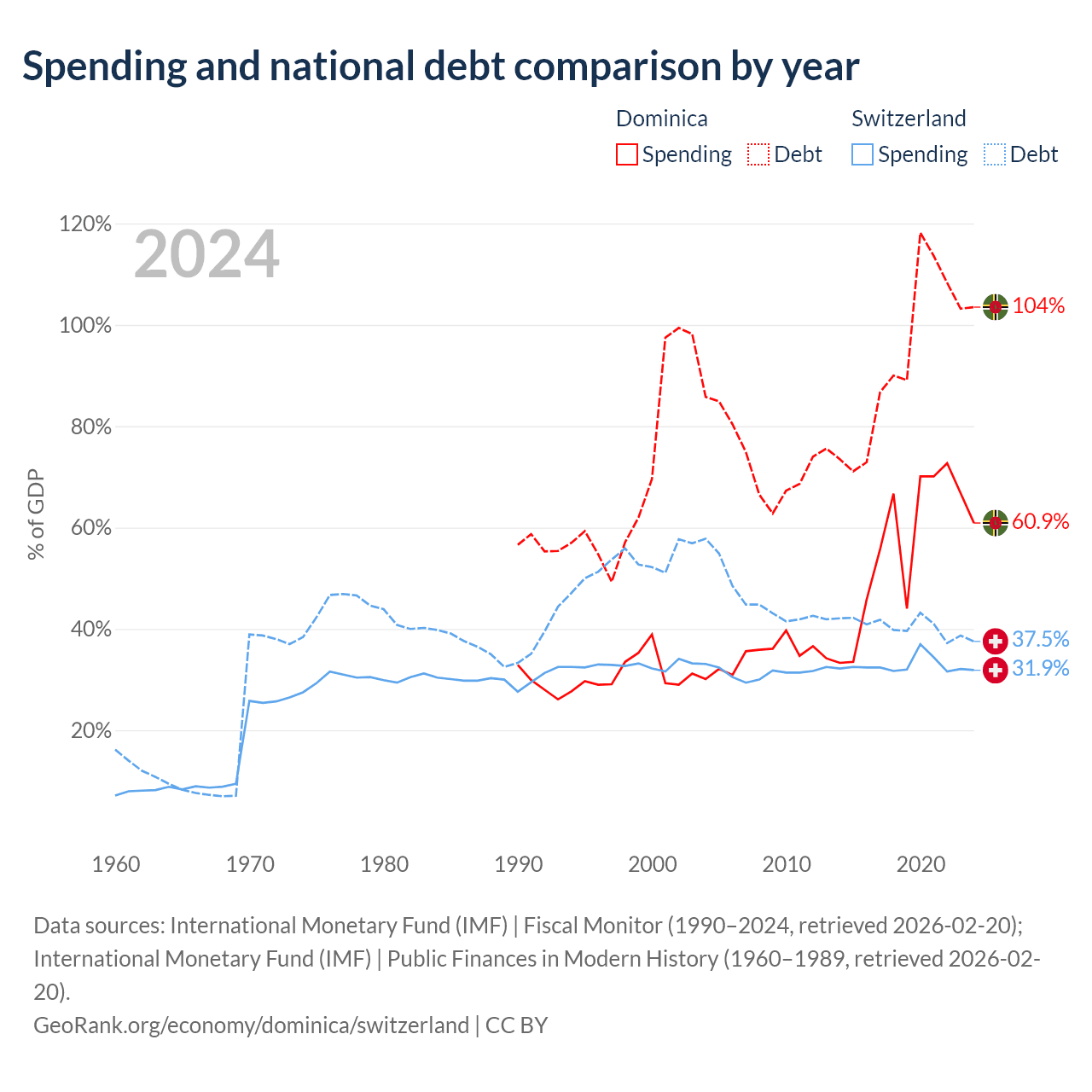 Dominica has $713M in government debt (103.5% of GDP), compared to $351B (37.5% of GDP) in Switzerland.