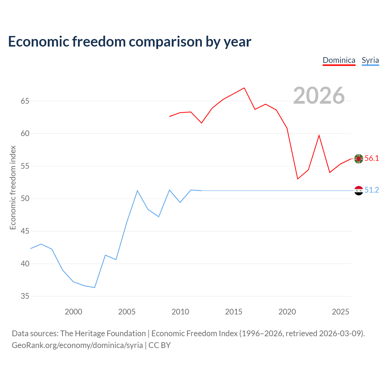The Economic Freedom Index for Dominica is 56.1, ranking 124/197, compared to 51.2 for Syria, ranking 155/197. The chart above displays a comparison of annual changes in economic freedom indexes.