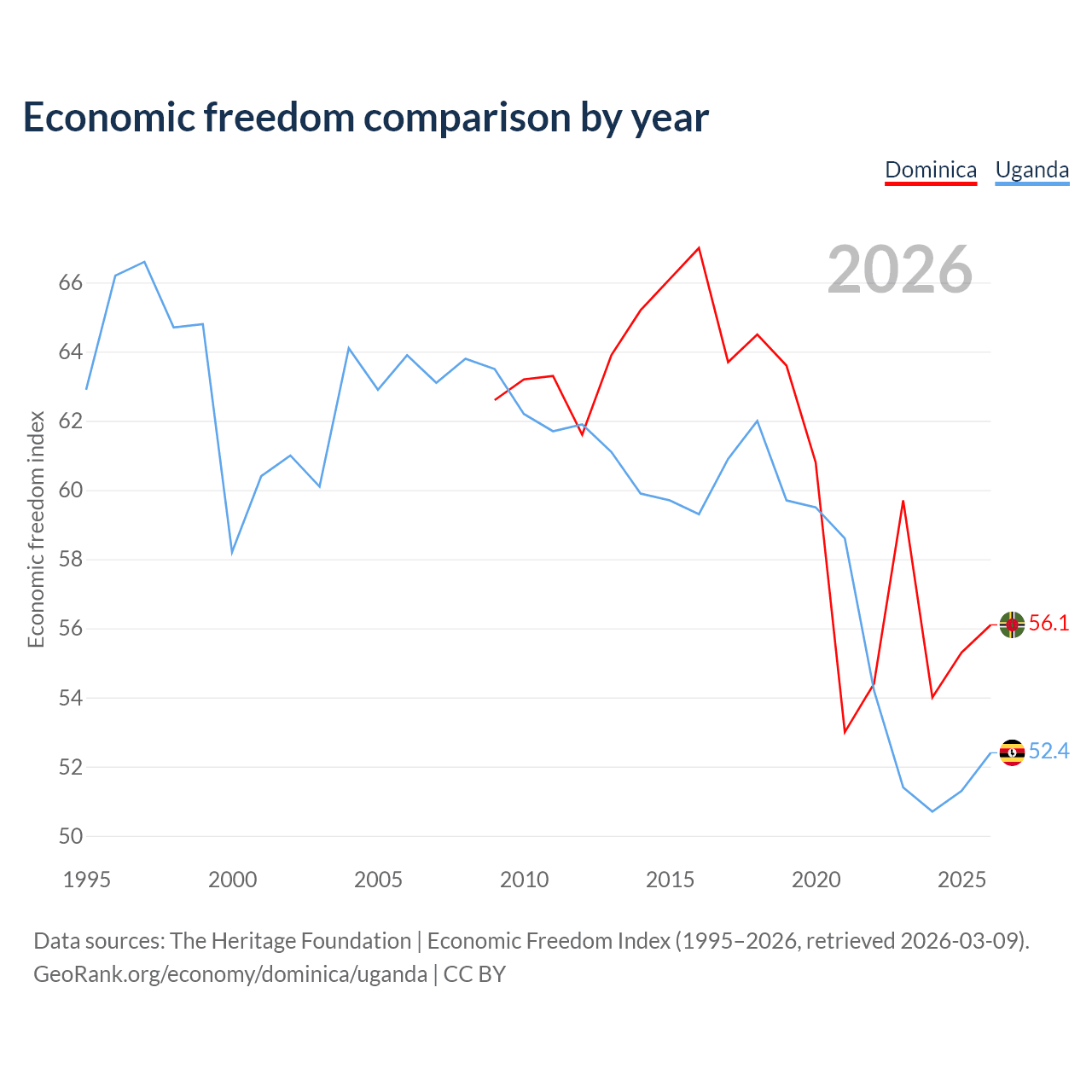 The Economic Freedom Index for Dominica is 56.1, ranking 124/197, compared to 52.4 for Uganda, ranking 149/197. The chart above displays a comparison of annual changes in economic freedom indexes.