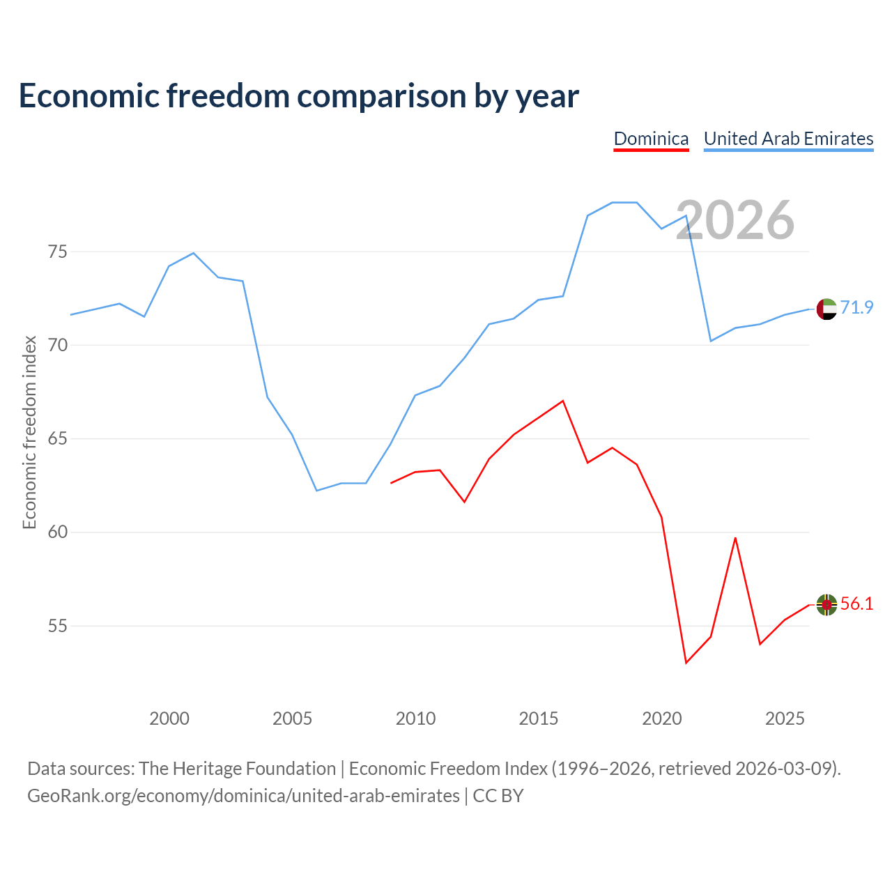 The Economic Freedom Index for Dominica is 56.1, ranking 124/197, compared to 71.9 for the United Arab Emirates, ranking 29/197. The chart above displays a comparison of annual changes in economic freedom indexes.