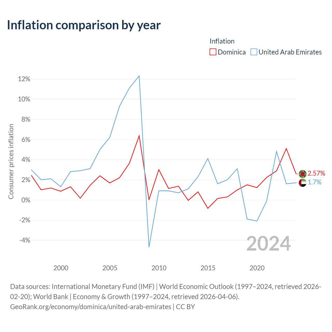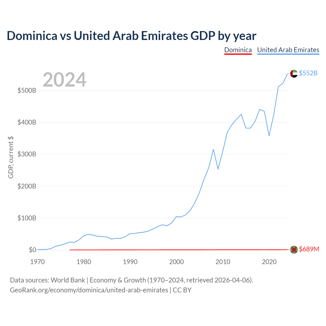 Dominica has a GDP of $689M compared to $552B for the United Arab Emirates, ranking 190/197 and 27/197 by economy size, respectively.