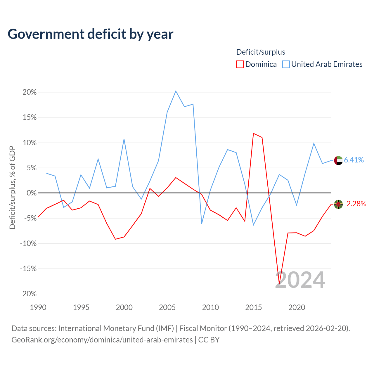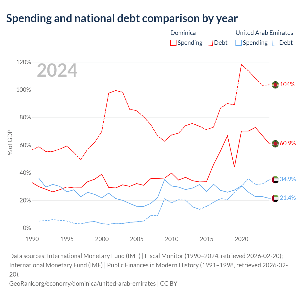 Dominica has $713M in government debt (103.5% of GDP), compared to $193B (34.9% of GDP) in the United Arab Emirates.