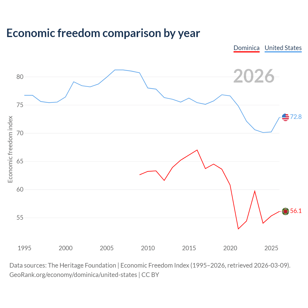 The Economic Freedom Index for Dominica is 56.1, ranking 124/197, compared to 72.8 for the United States, ranking 27/197. The chart above displays a comparison of annual changes in economic freedom indexes.