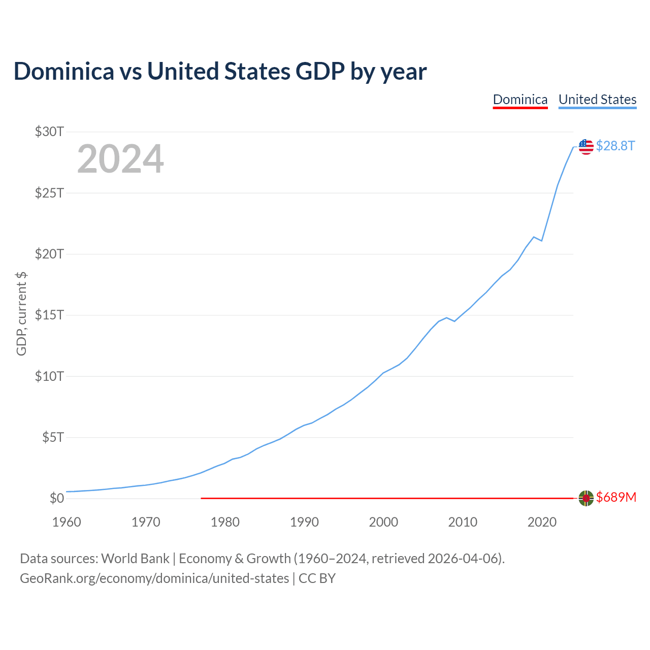Dominica has a GDP of $689M compared to $28.8T for the United States, ranking 190/197 and 1/197 by economy size, respectively.