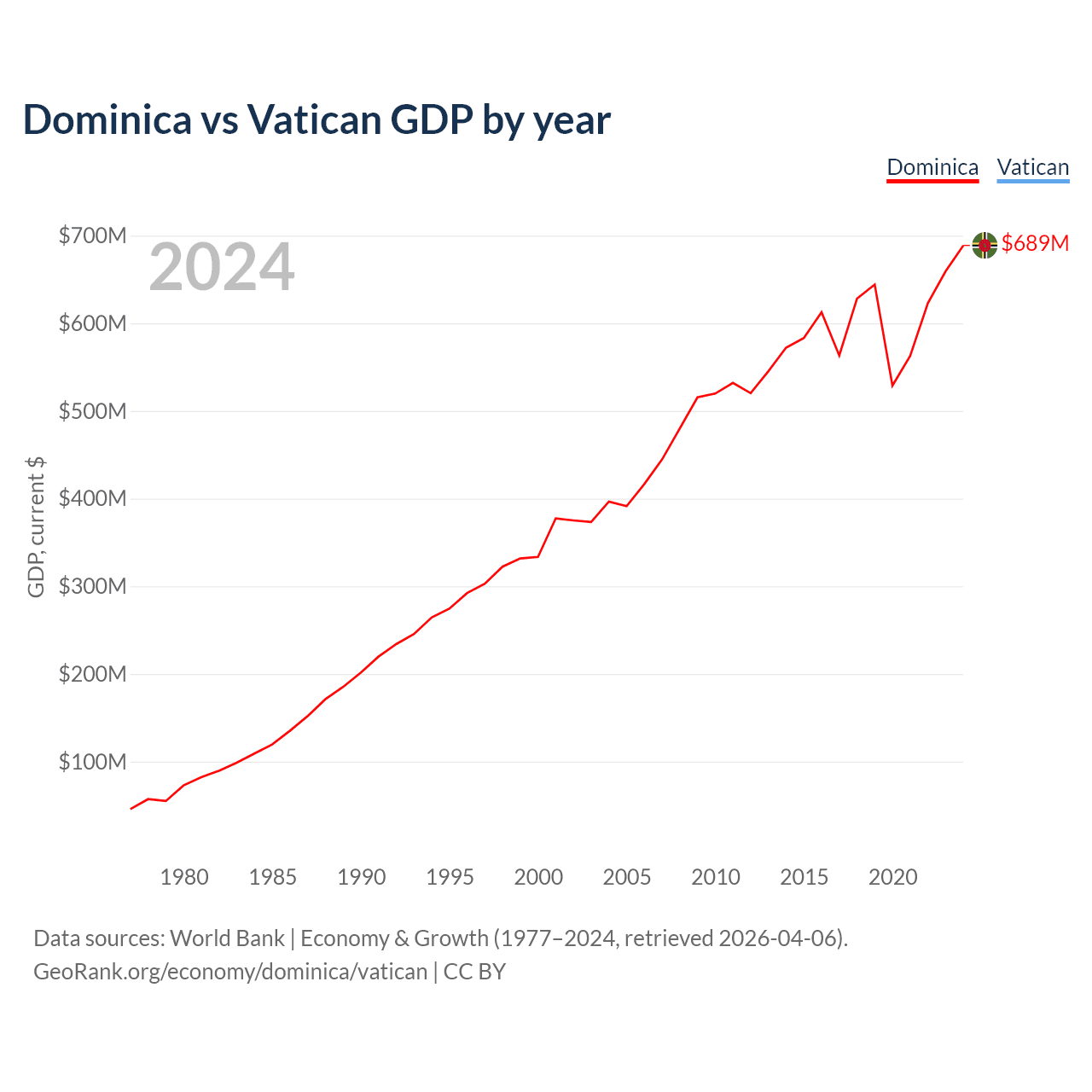 Dominica has a GDP of $689M compared to $19.8M for the Vatican, ranking 190/197 and 197/197 by economy size, respectively.