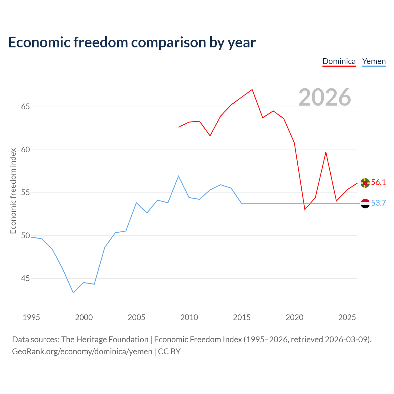 The Economic Freedom Index for Dominica is 56.1, ranking 124/197, compared to 53.7 for Yemen, ranking 138/197. The chart above displays a comparison of annual changes in economic freedom indexes.