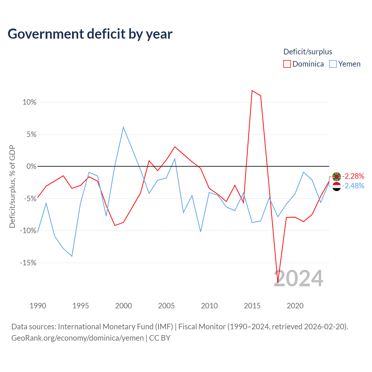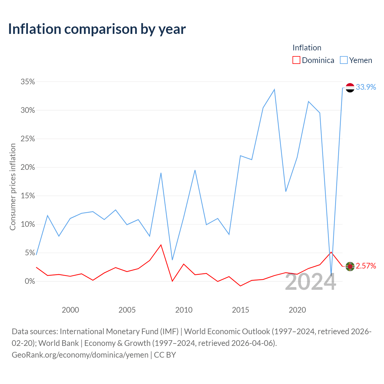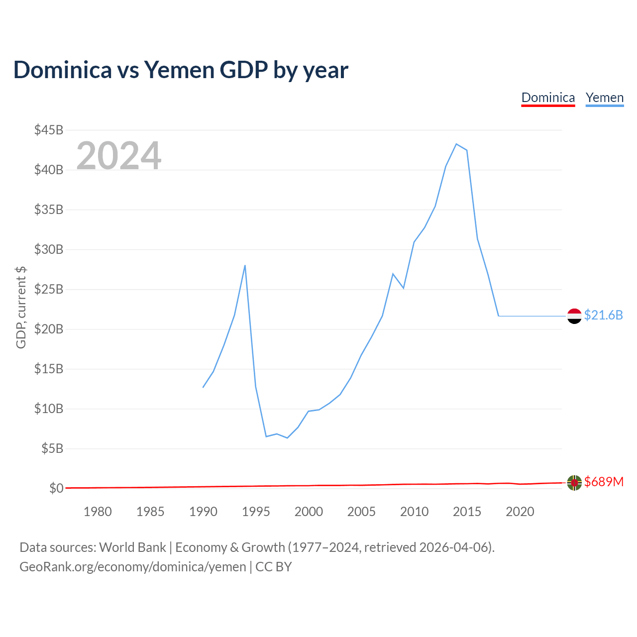 Dominica has a GDP of $689M compared to $21.6B for Yemen, ranking 190/197 and 125/197 by economy size, respectively.