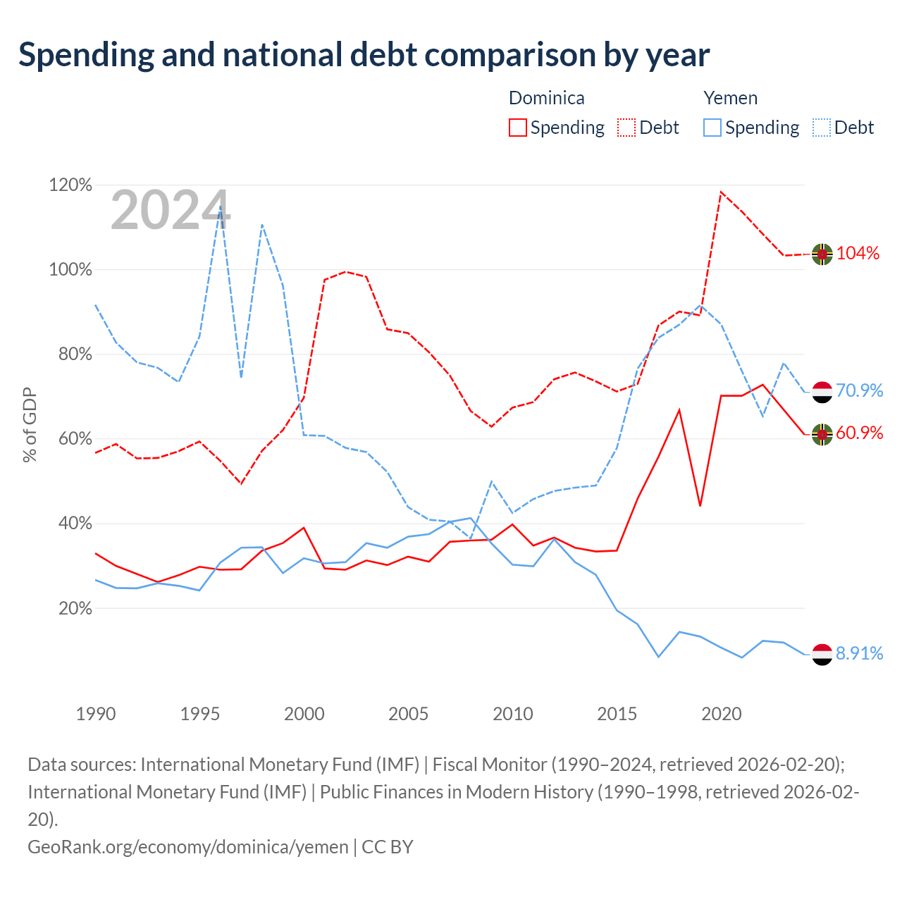 Dominica has $713M in government debt (103.5% of GDP), compared to $18.8B (70.9% of GDP) in Yemen.
