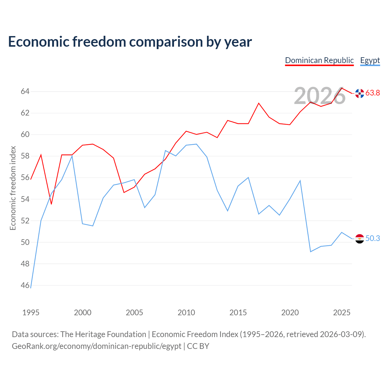 The Economic Freedom Index for the Dominican Republic is 63.8, ranking 77/197, compared to 50.3 for Egypt, ranking 160/197. The chart above displays a comparison of annual changes in economic freedom indexes.