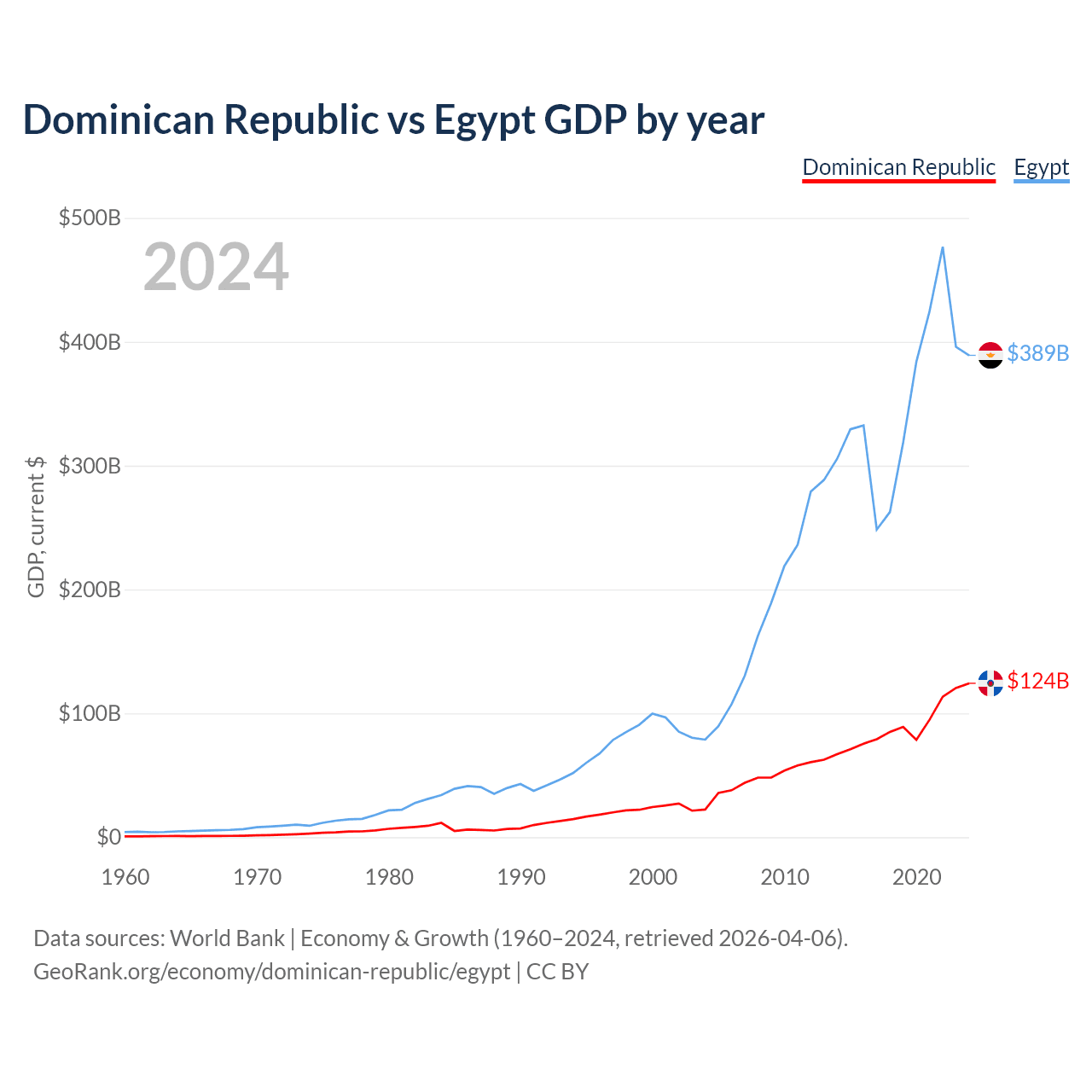 The Dominican Republic has a GDP of $124B compared to $389B for Egypt, ranking 63/197 and 41/197 by economy size, respectively.
