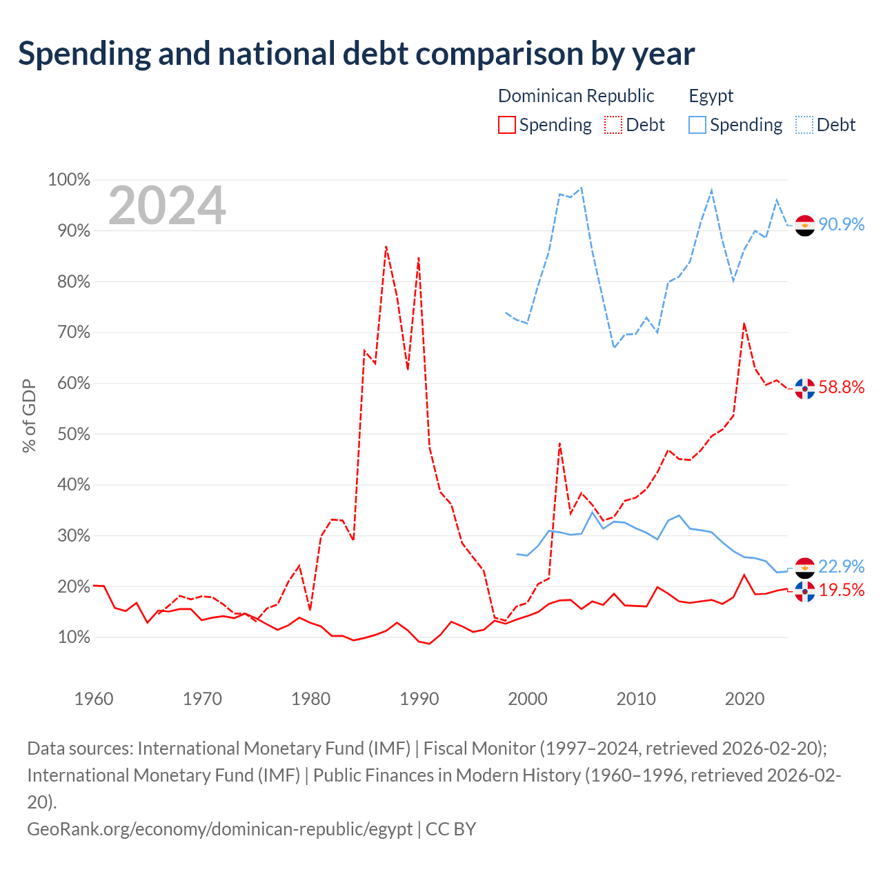 The Dominican Republic has $73.1B in government debt (58.8% of GDP), compared to $354B (90.9% of GDP) in Egypt.