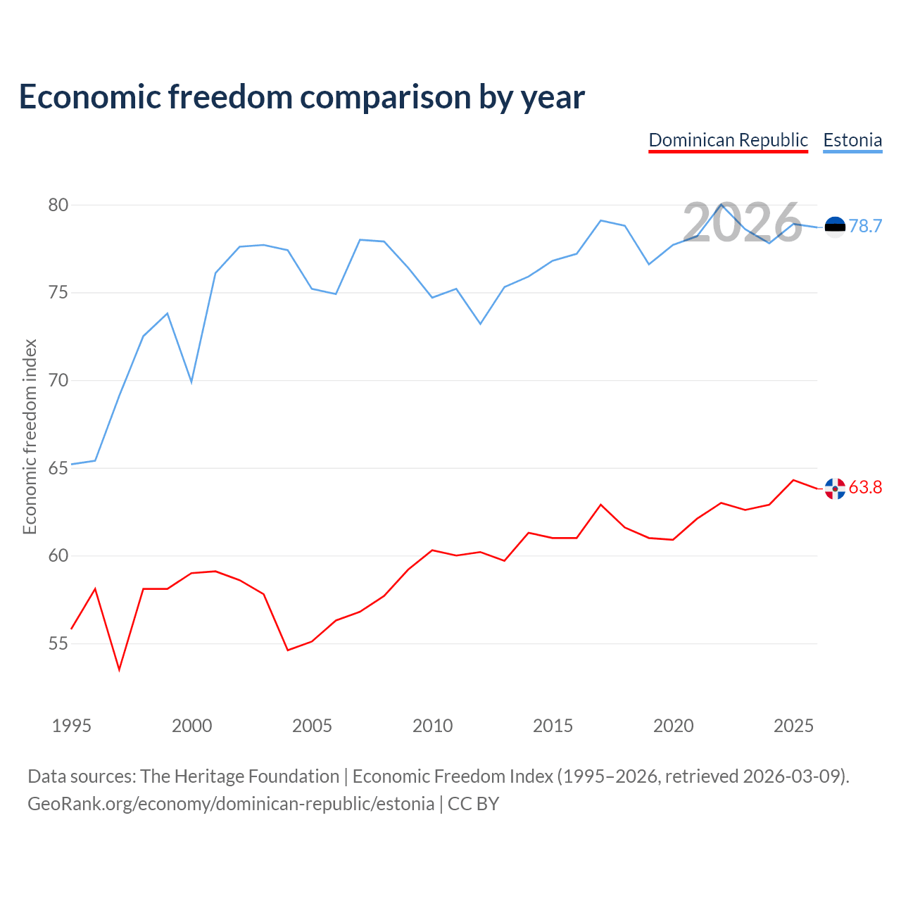 The Economic Freedom Index for the Dominican Republic is 63.8, ranking 77/197, compared to 78.7 for Estonia, ranking 10/197. The chart above displays a comparison of annual changes in economic freedom indexes.