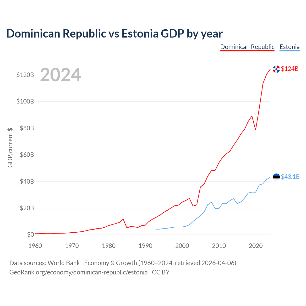 The Dominican Republic has a GDP of $124B compared to $43.1B for Estonia, ranking 63/197 and 100/197 by economy size, respectively.