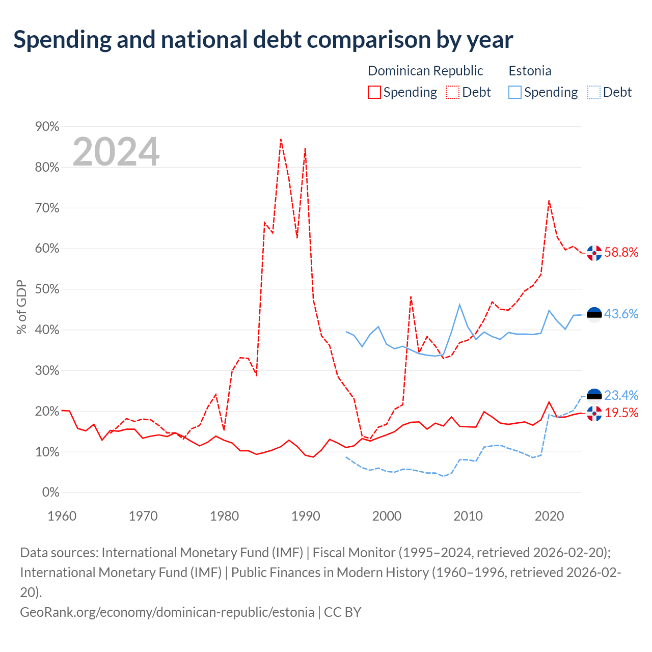 The Dominican Republic has $73.1B in government debt (58.8% of GDP), compared to $10.1B (23.4% of GDP) in Estonia.
