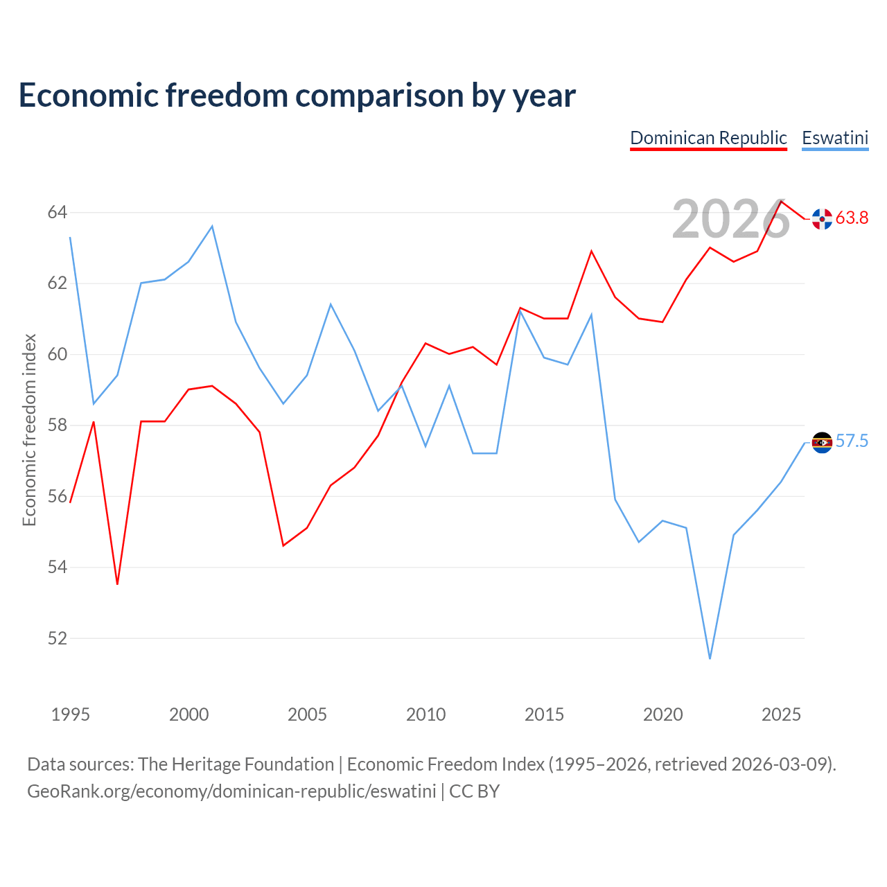 The Economic Freedom Index for the Dominican Republic is 63.8, ranking 77/197, compared to 57.5 for Eswatini, ranking 116/197. The chart above displays a comparison of annual changes in economic freedom indexes.