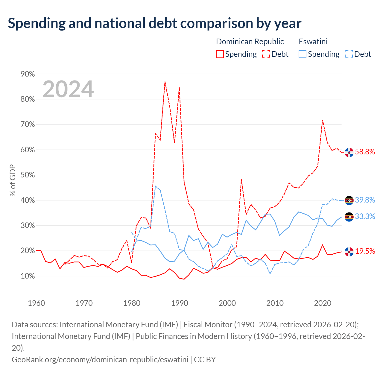 The Dominican Republic has $73.1B in government debt (58.8% of GDP), compared to $1.93B (39.8% of GDP) in Eswatini.
