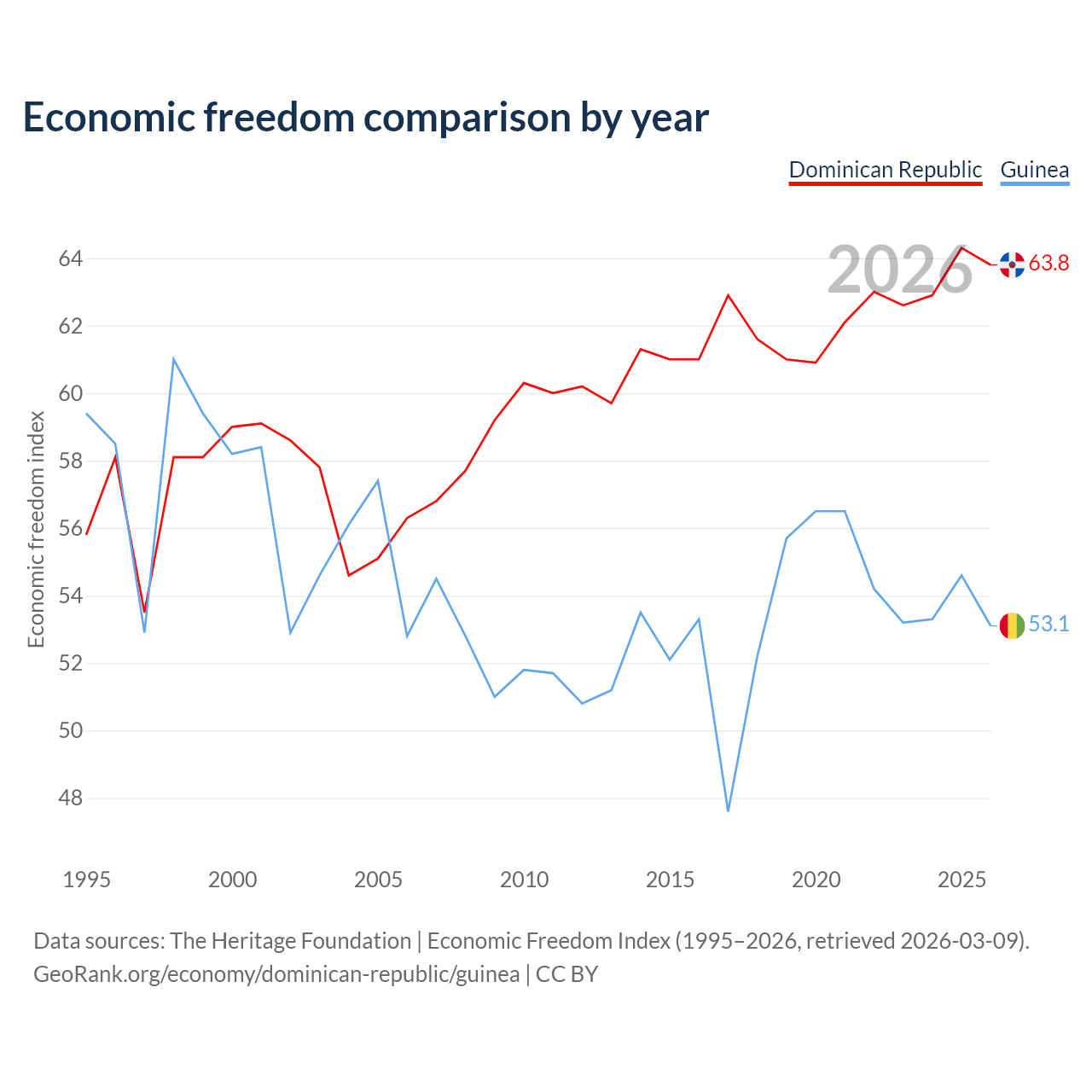 The Economic Freedom Index for the Dominican Republic is 63.8, ranking 77/197, compared to 53.1 for Guinea, ranking 141/197. The chart above displays a comparison of annual changes in economic freedom indexes.