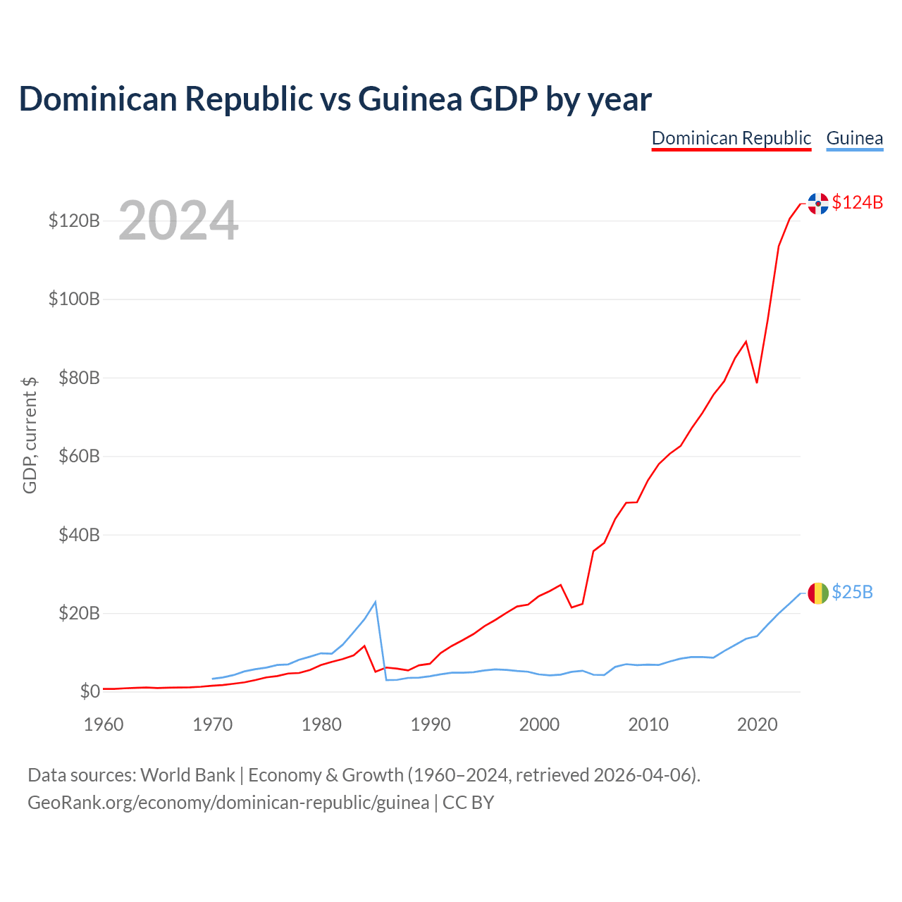 The Dominican Republic has a GDP of $124B compared to $25B for Guinea, ranking 63/197 and 118/197 by economy size, respectively.