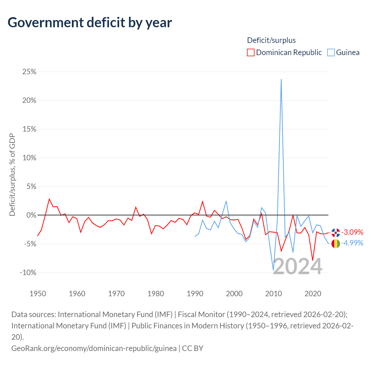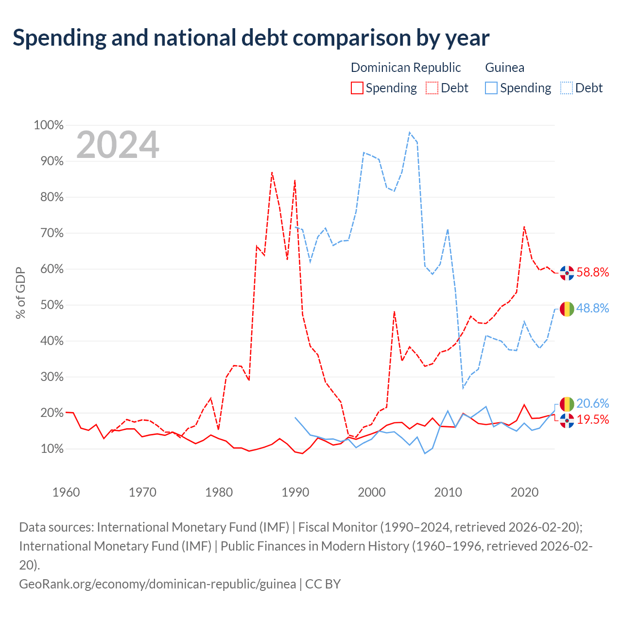 The Dominican Republic has $73.1B in government debt (58.8% of GDP), compared to $12.2B (48.8% of GDP) in Guinea.