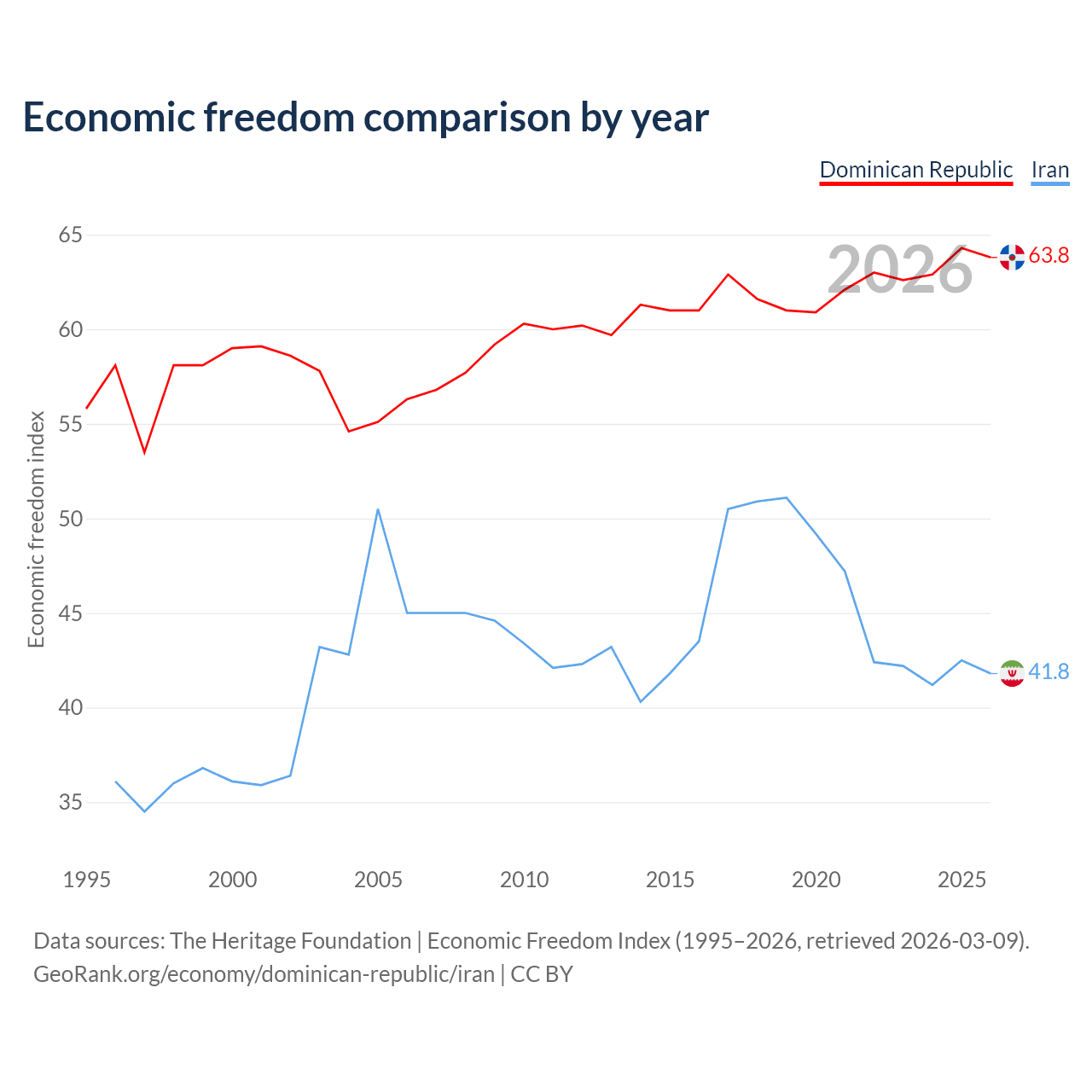 The Economic Freedom Index for the Dominican Republic is 63.8, ranking 77/197, compared to 41.8 for Iran, ranking 185/197. The chart above displays a comparison of annual changes in economic freedom indexes.