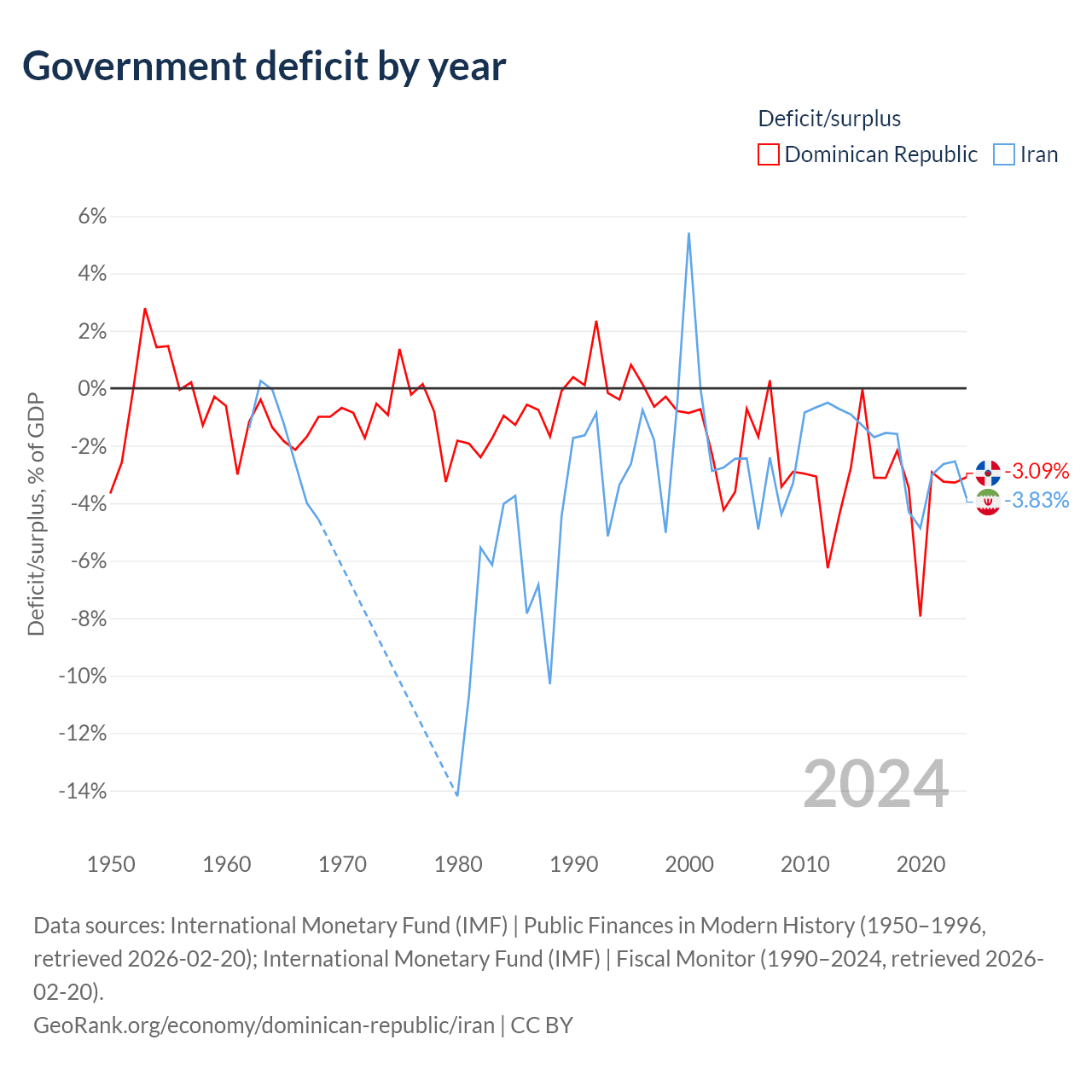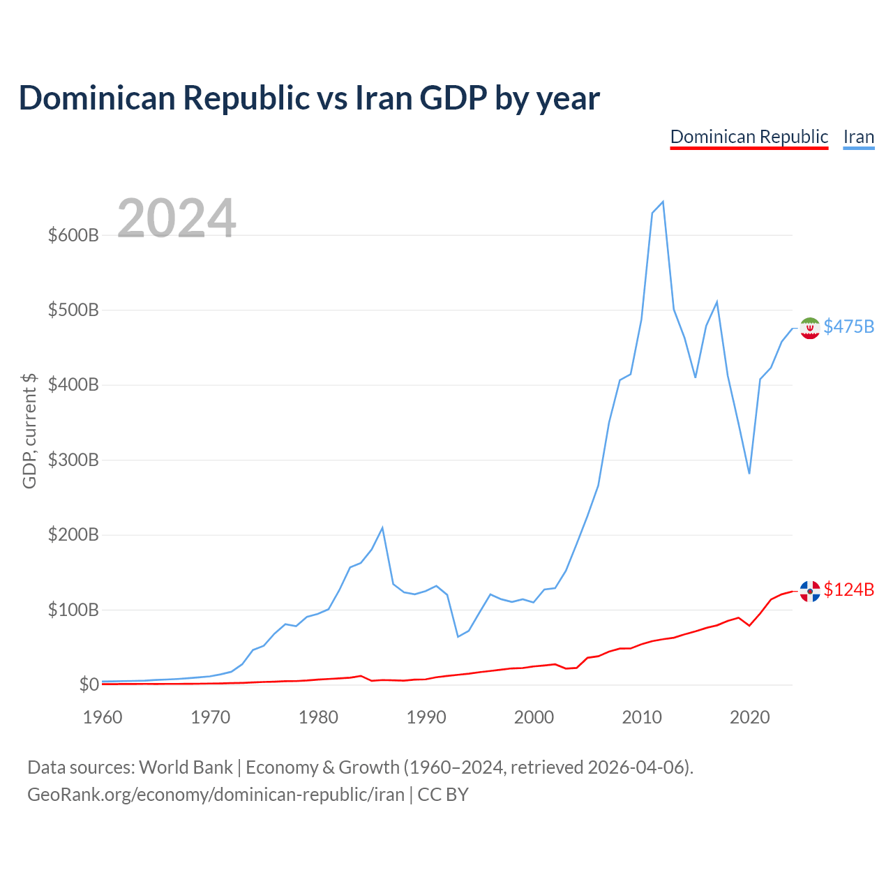 The Dominican Republic has a GDP of $124B compared to $475B for Iran, ranking 63/197 and 34/197 by economy size, respectively.