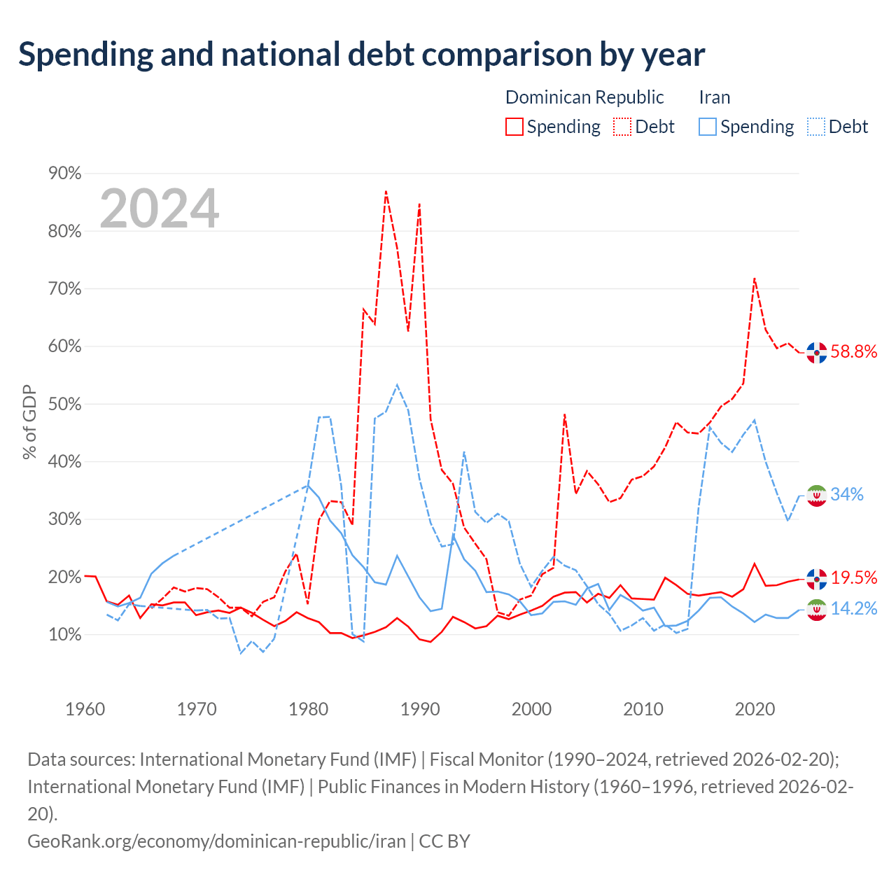 The Dominican Republic has $73.1B in government debt (58.8% of GDP), compared to $162B (34% of GDP) in Iran.