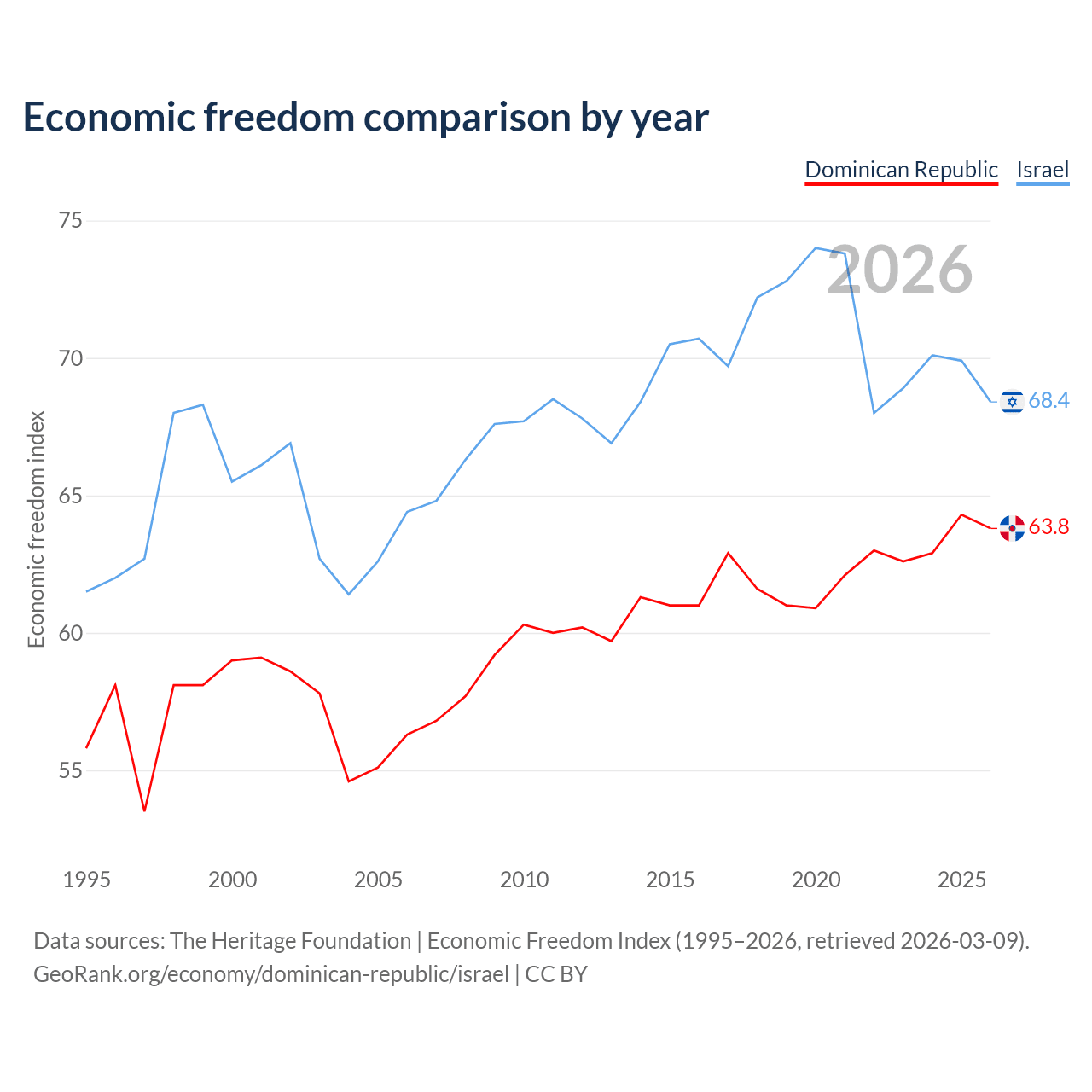 The Economic Freedom Index for the Dominican Republic is 63.8, ranking 77/197, compared to 68.4 for Israel, ranking 47/197. The chart above displays a comparison of annual changes in economic freedom indexes.