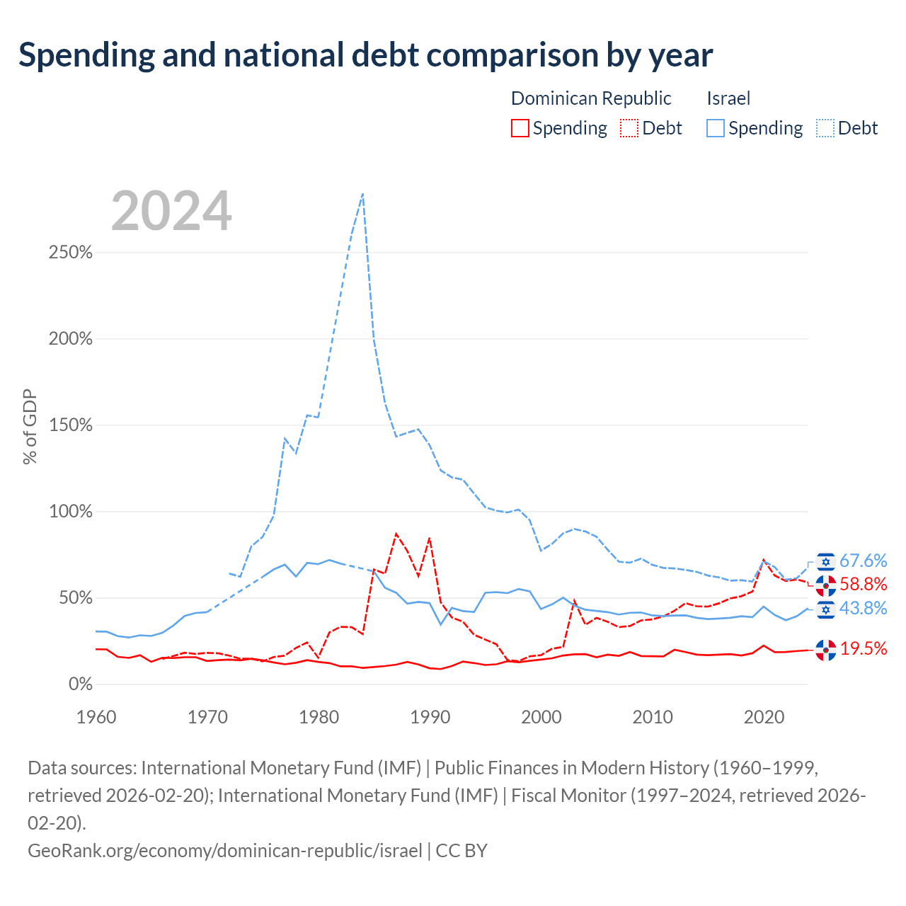 The Dominican Republic has $73.1B in government debt (58.8% of GDP), compared to $366B (67.6% of GDP) in Israel.
