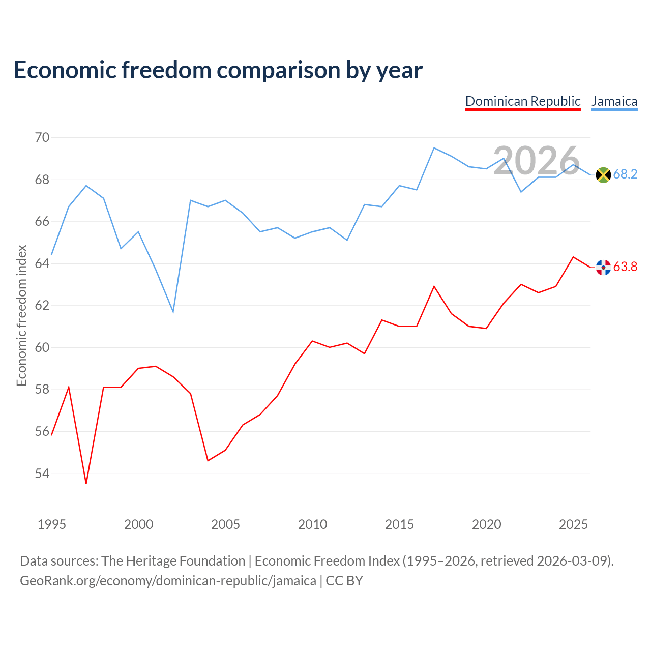 The Economic Freedom Index for the Dominican Republic is 63.8, ranking 77/197, compared to 68.2 for Jamaica, ranking 48/197. The chart above displays a comparison of annual changes in economic freedom indexes.