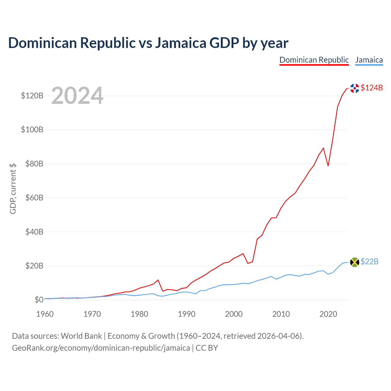 The Dominican Republic has a GDP of $124B compared to $22B for Jamaica, ranking 63/197 and 124/197 by economy size, respectively.