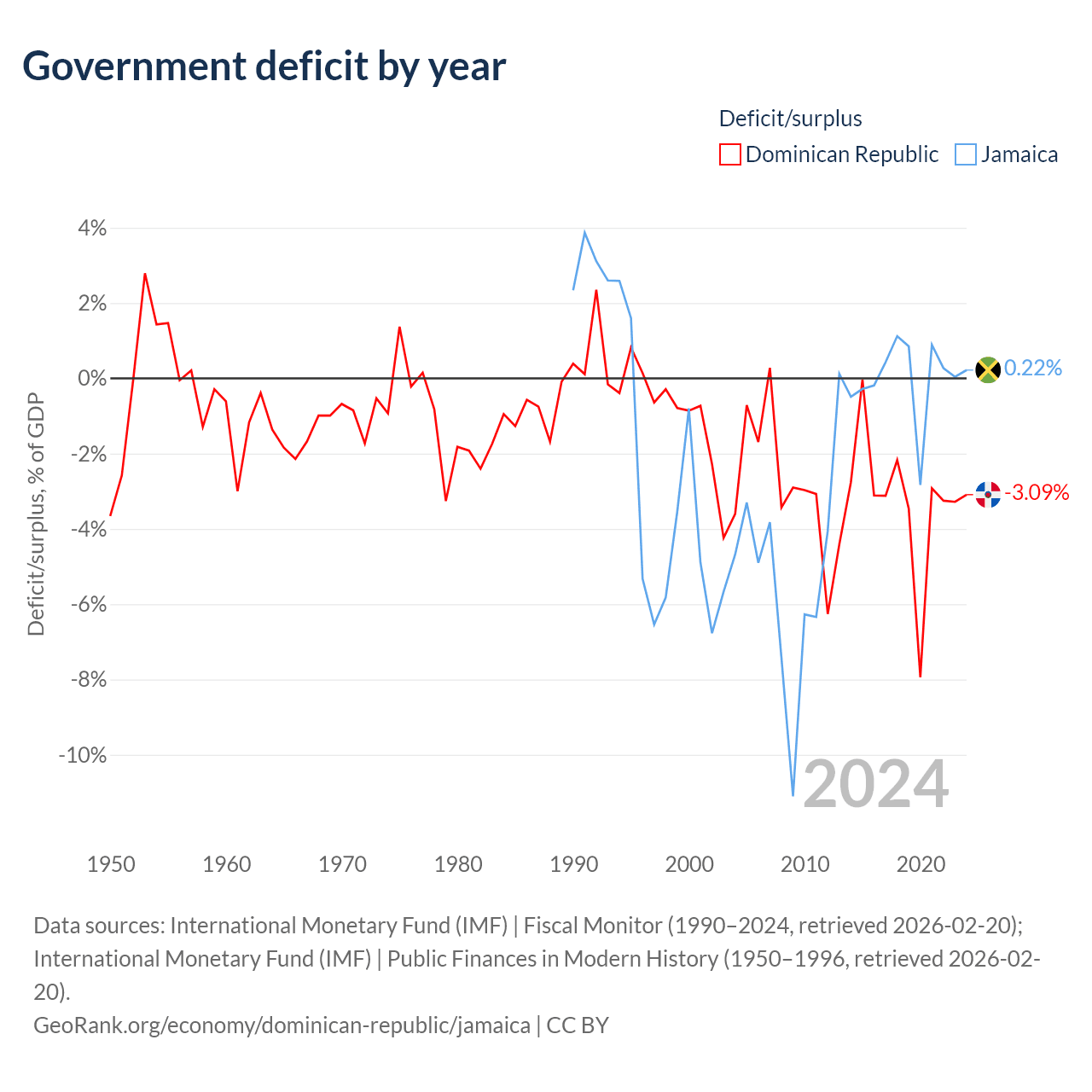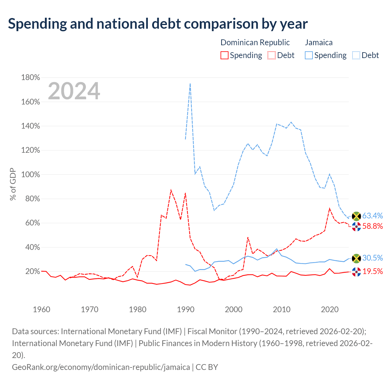 The Dominican Republic has $73.1B in government debt (58.8% of GDP), compared to $14B (63.4% of GDP) in Jamaica.