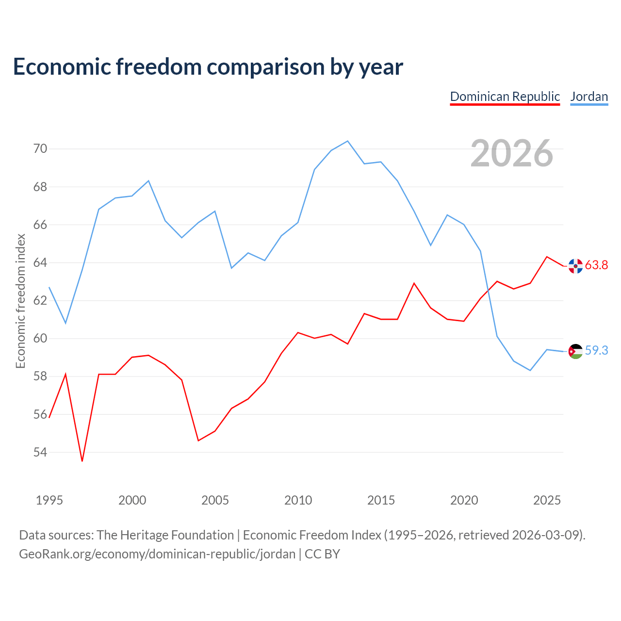 The Economic Freedom Index for the Dominican Republic is 63.8, ranking 77/197, compared to 59.3 for Jordan, ranking 104/197. The chart above displays a comparison of annual changes in economic freedom indexes.