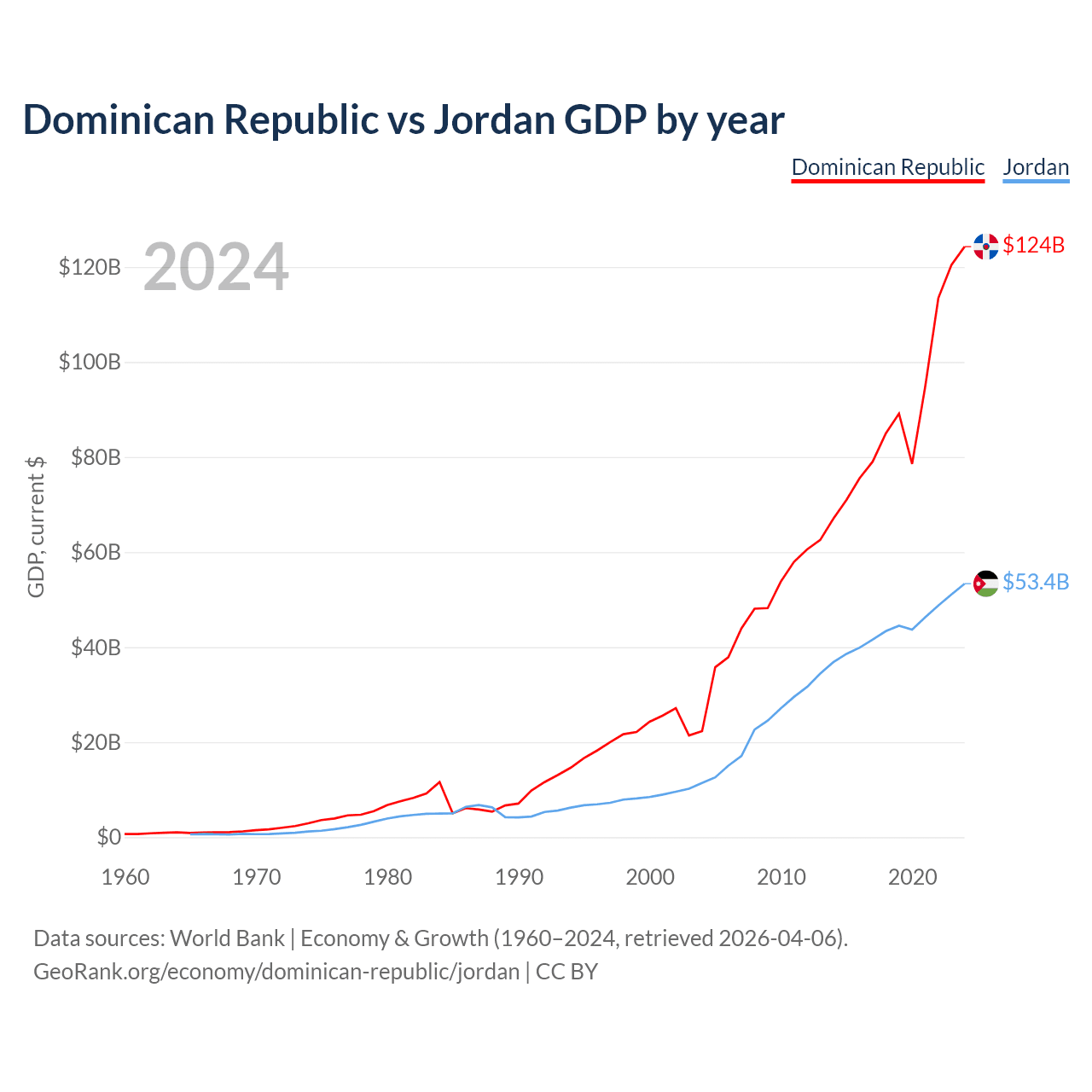 The Dominican Republic has a GDP of $124B compared to $53.4B for Jordan, ranking 63/197 and 90/197 by economy size, respectively.