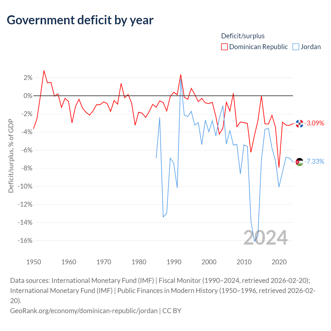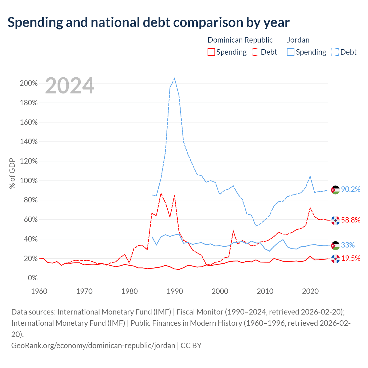 The Dominican Republic has $73.1B in government debt (58.8% of GDP), compared to $48.1B (90.2% of GDP) in Jordan.