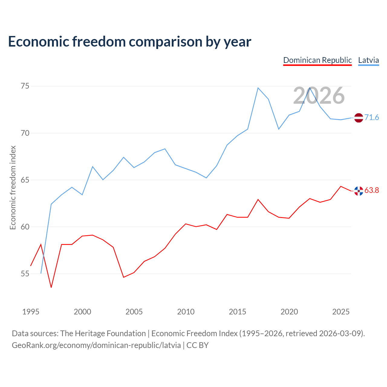 The Economic Freedom Index for the Dominican Republic is 63.8, ranking 77/197, compared to 71.6 for Latvia, ranking 31/197. The chart above displays a comparison of annual changes in economic freedom indexes.