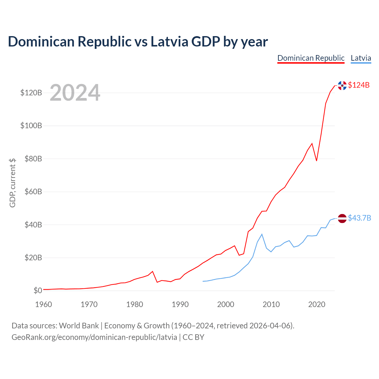 The Dominican Republic has a GDP of $124B compared to $43.7B for Latvia, ranking 63/197 and 99/197 by economy size, respectively.