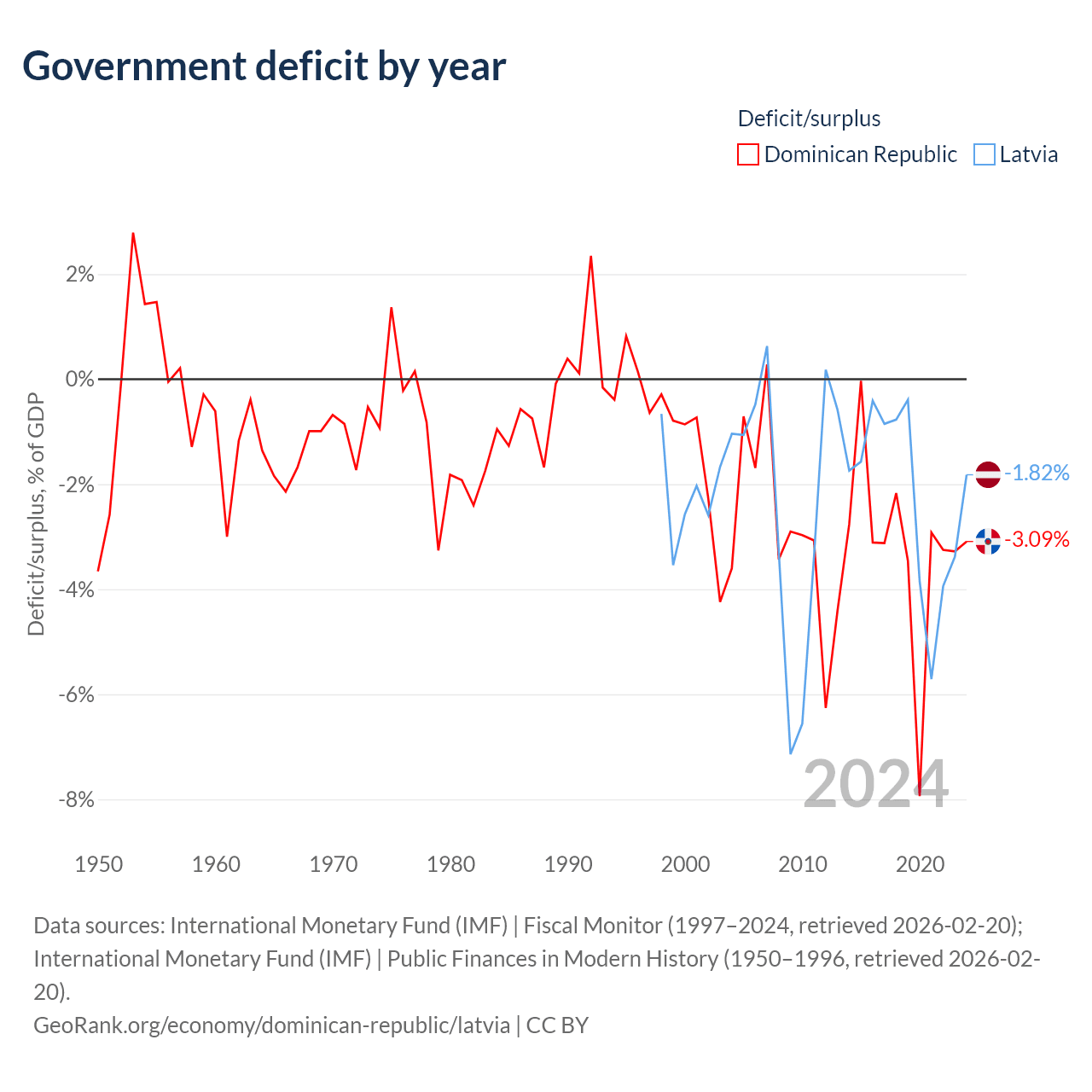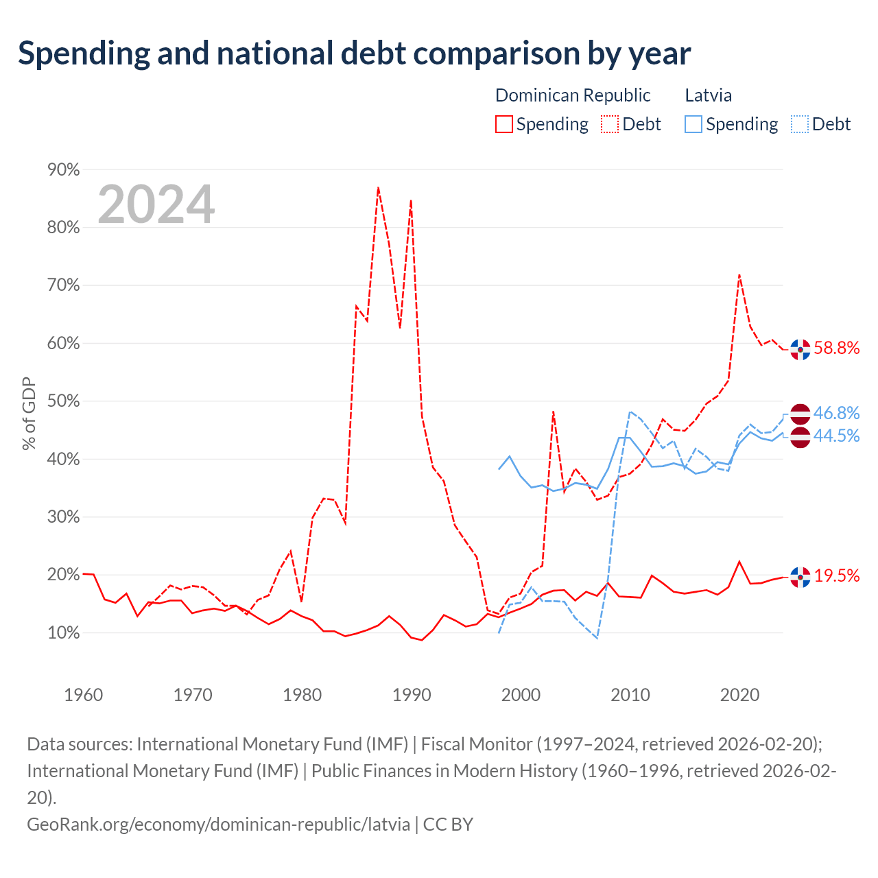 The Dominican Republic has $73.1B in government debt (58.8% of GDP), compared to $20.4B (46.8% of GDP) in Latvia.
