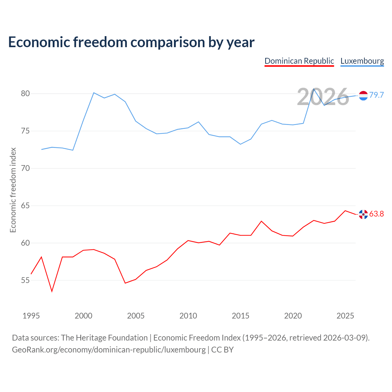 The Economic Freedom Index for the Dominican Republic is 63.8, ranking 77/197, compared to 79.7 for Luxembourg, ranking 7/197. The chart above displays a comparison of annual changes in economic freedom indexes.