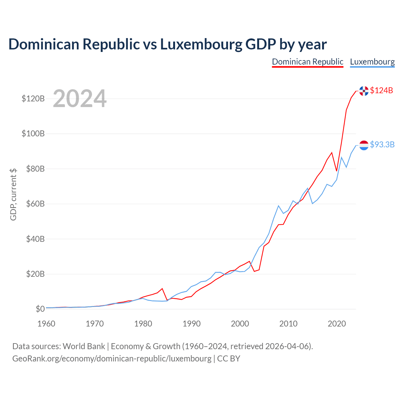 The Dominican Republic has a GDP of $124B compared to $93.3B for Luxembourg, ranking 63/197 and 74/197 by economy size, respectively.