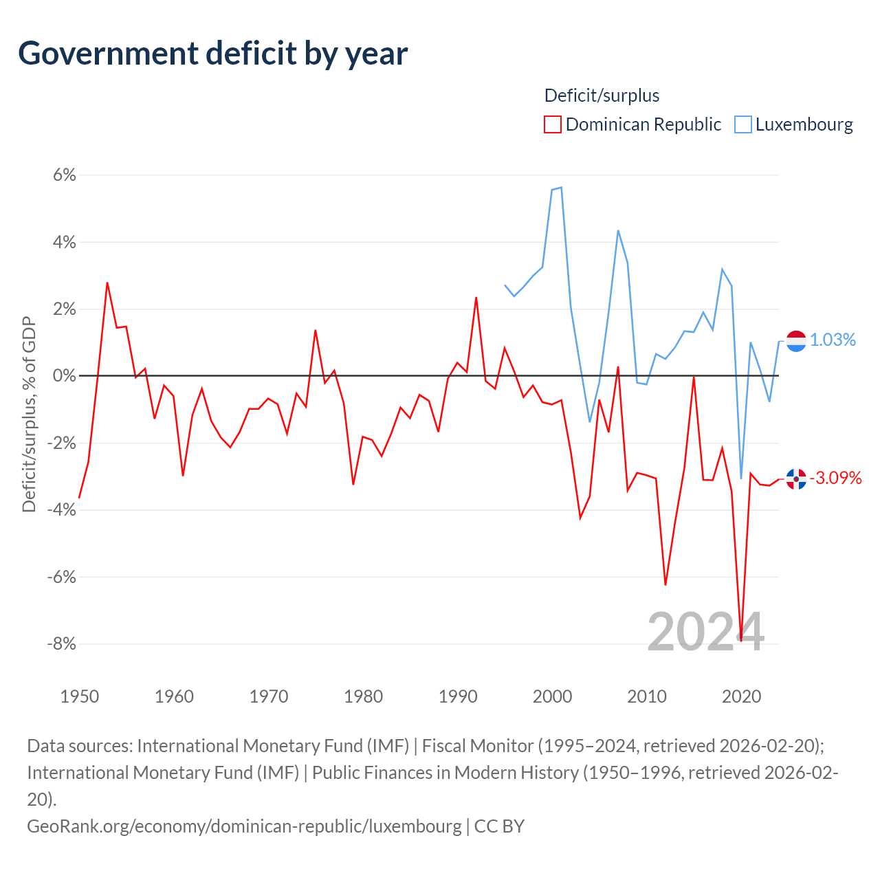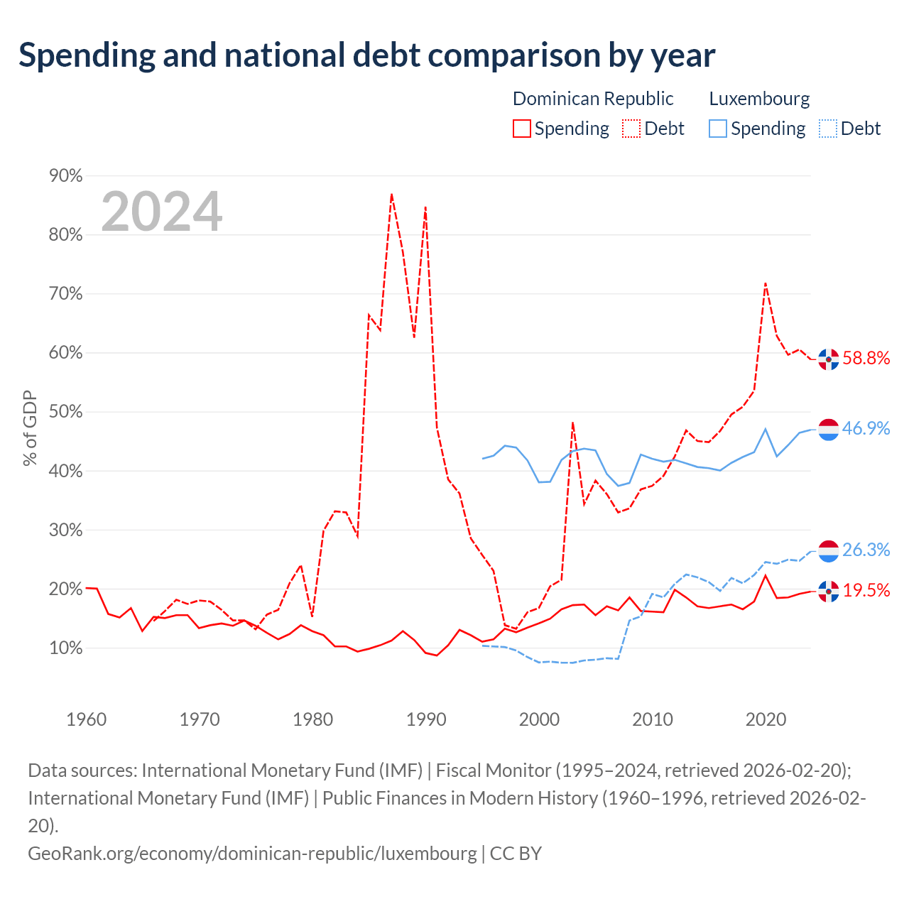The Dominican Republic has $73.1B in government debt (58.8% of GDP), compared to $24.5B (26.3% of GDP) in Luxembourg.