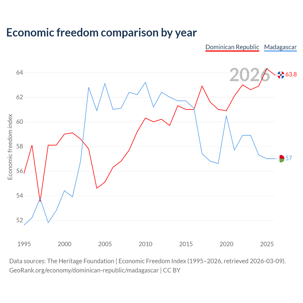 The Economic Freedom Index for the Dominican Republic is 63.8, ranking 77/197, compared to 57 for Madagascar, ranking 119/197. The chart above displays a comparison of annual changes in economic freedom indexes.