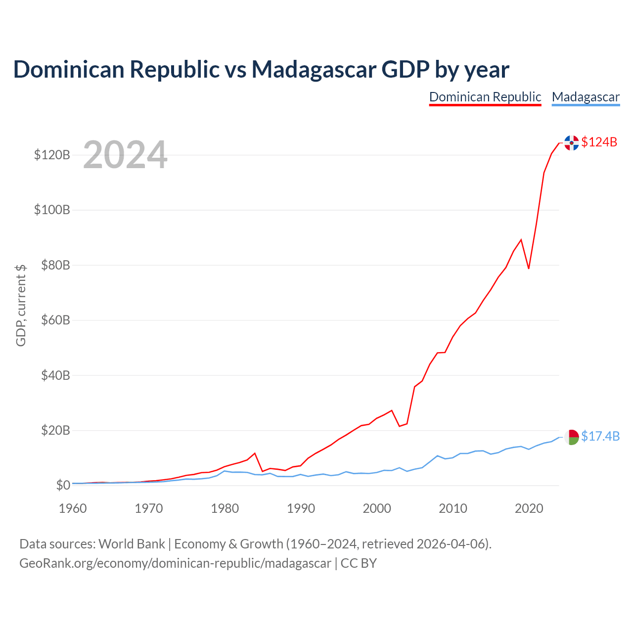 The Dominican Republic has a GDP of $124B compared to $17.4B for Madagascar, ranking 63/197 and 136/197 by economy size, respectively.
