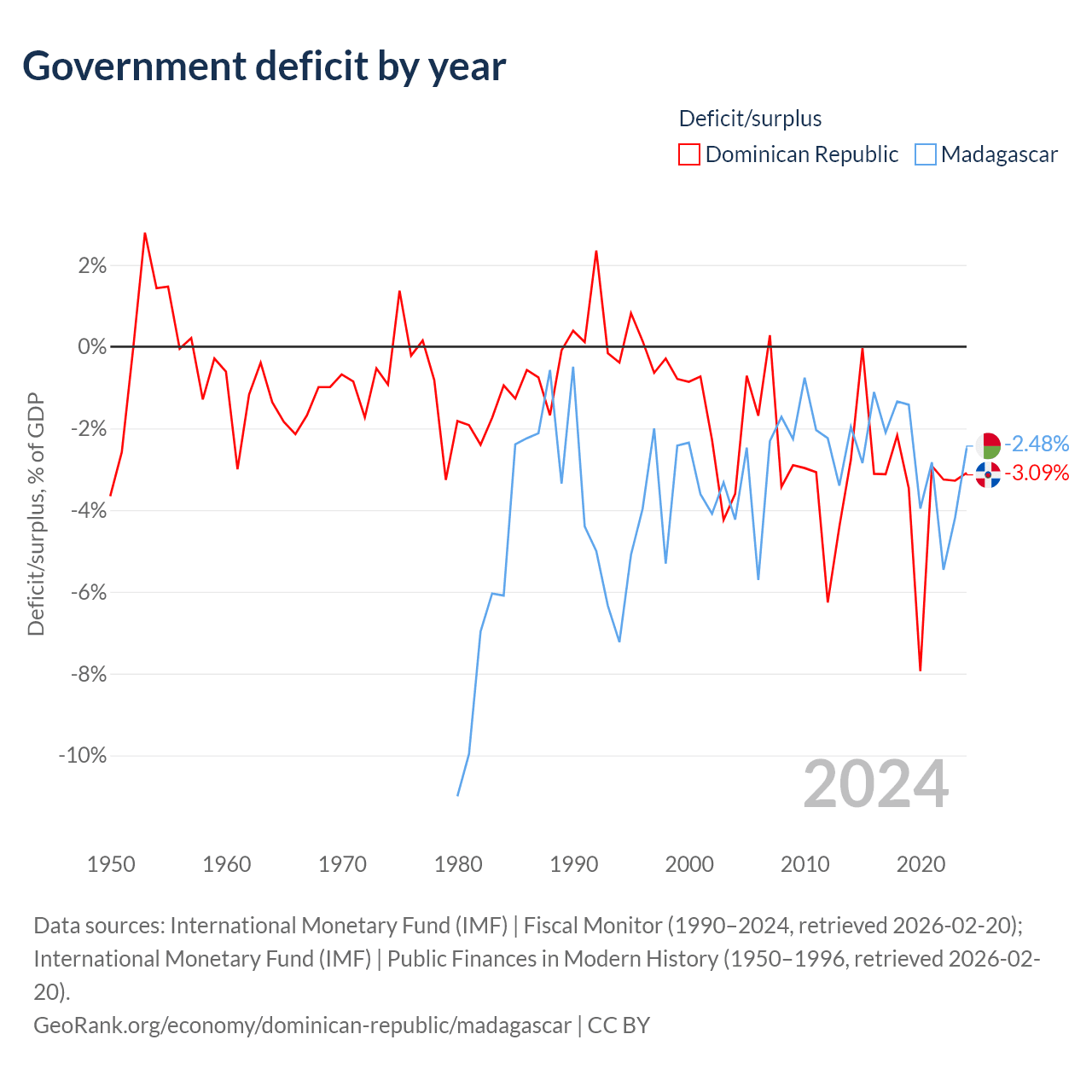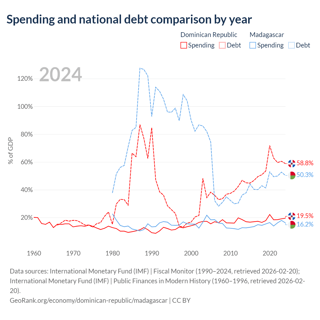 The Dominican Republic has $73.1B in government debt (58.8% of GDP), compared to $8.77B (50.3% of GDP) in Madagascar.