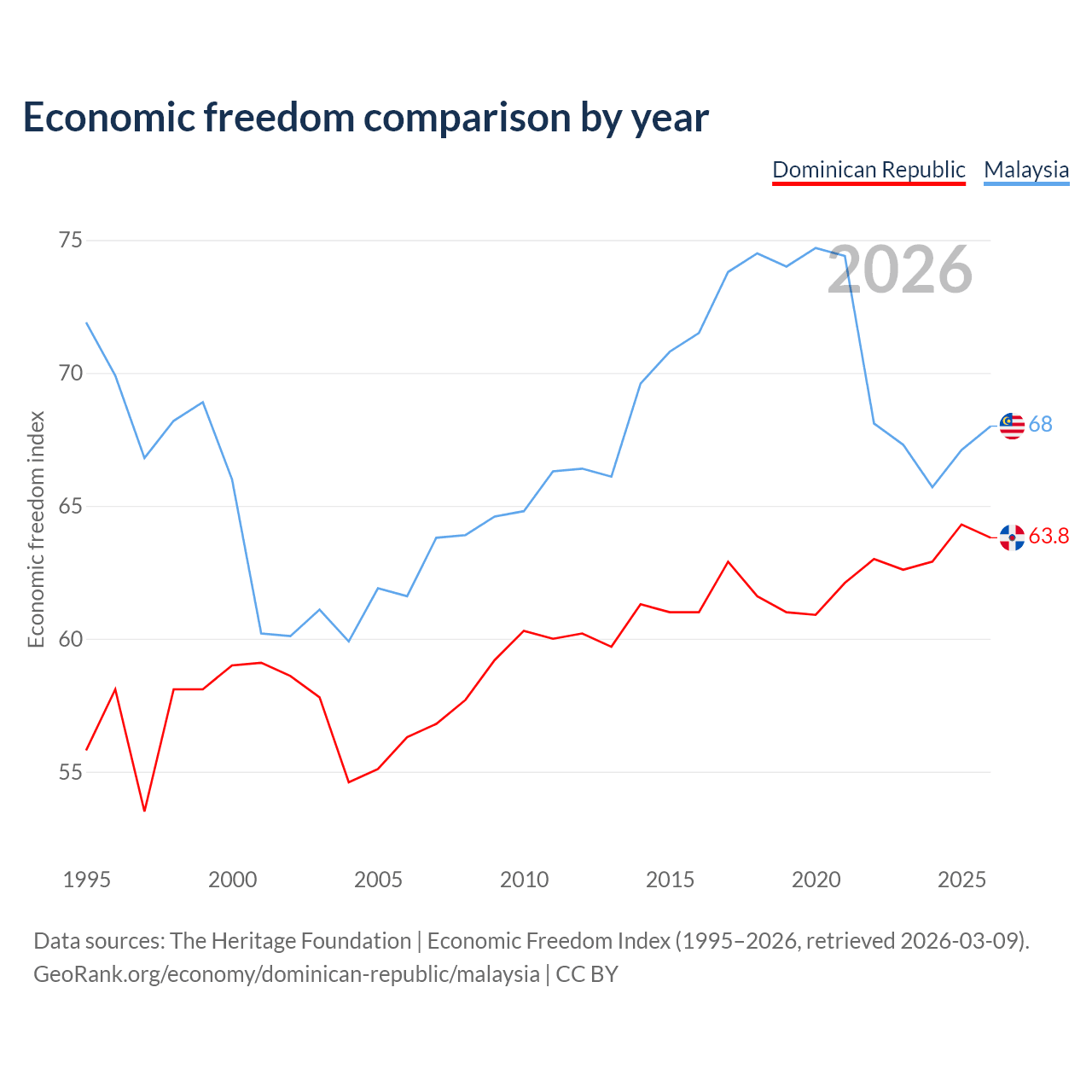 The Economic Freedom Index for the Dominican Republic is 63.8, ranking 77/197, compared to 68 for Malaysia, ranking 51/197. The chart above displays a comparison of annual changes in economic freedom indexes.