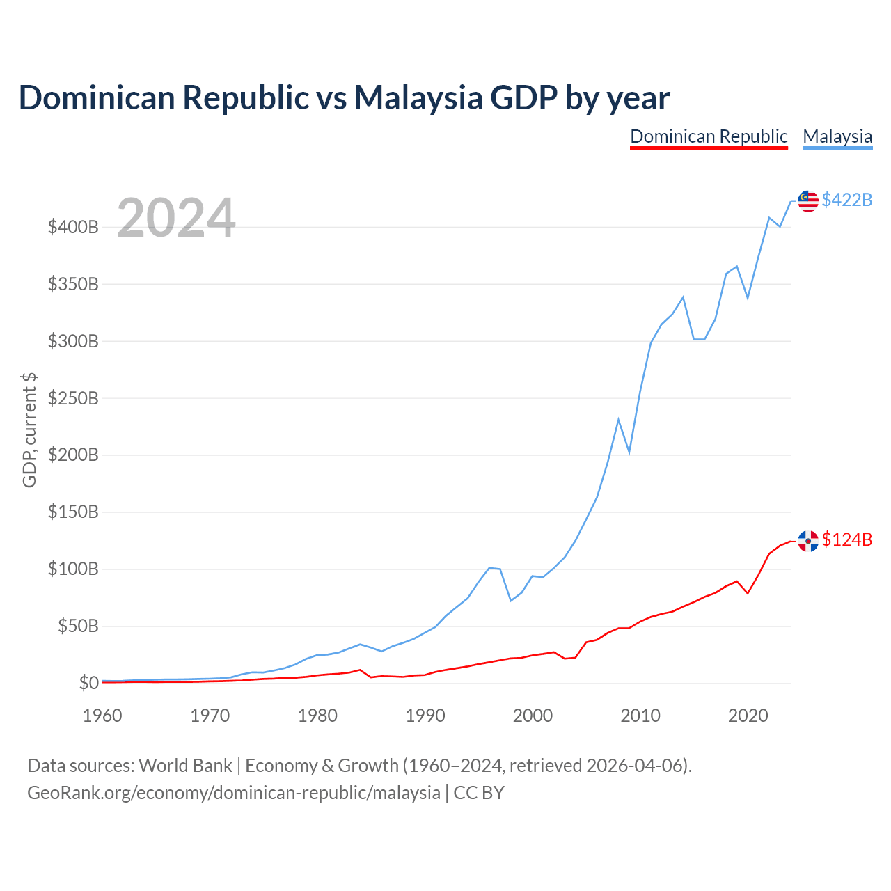 The Dominican Republic has a GDP of $124B compared to $422B for Malaysia, ranking 63/197 and 38/197 by economy size, respectively.
