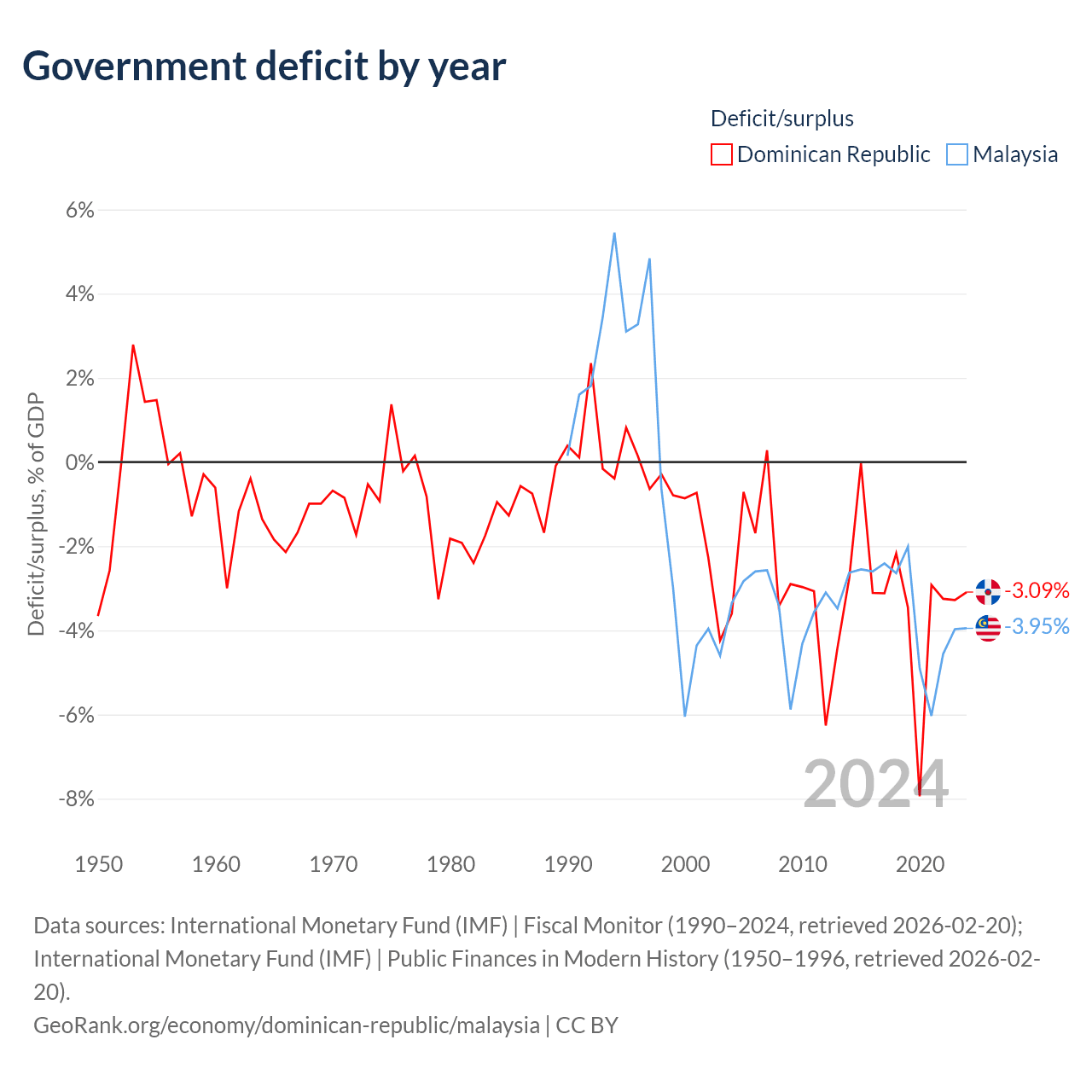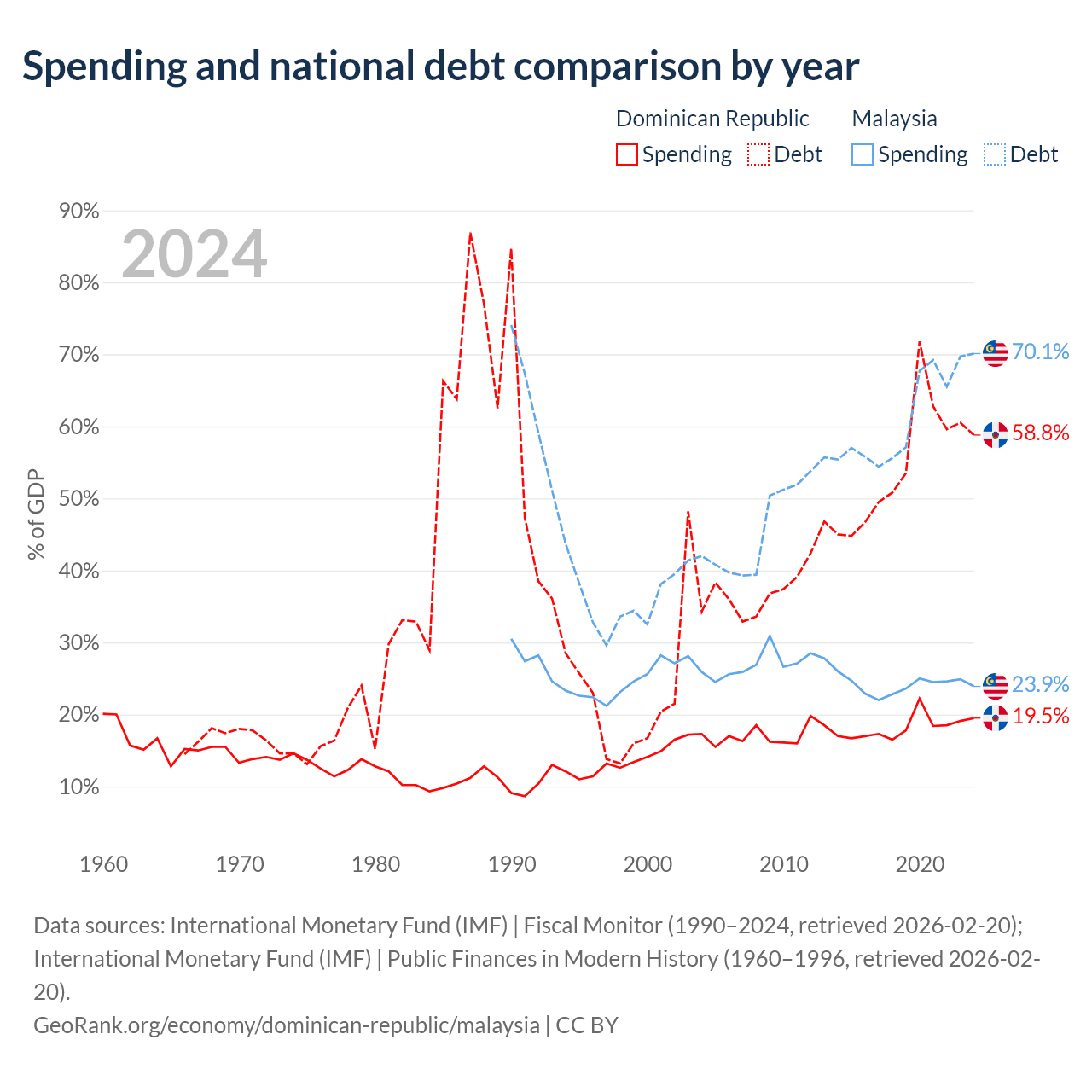 The Dominican Republic has $73.1B in government debt (58.8% of GDP), compared to $296B (70.1% of GDP) in Malaysia.