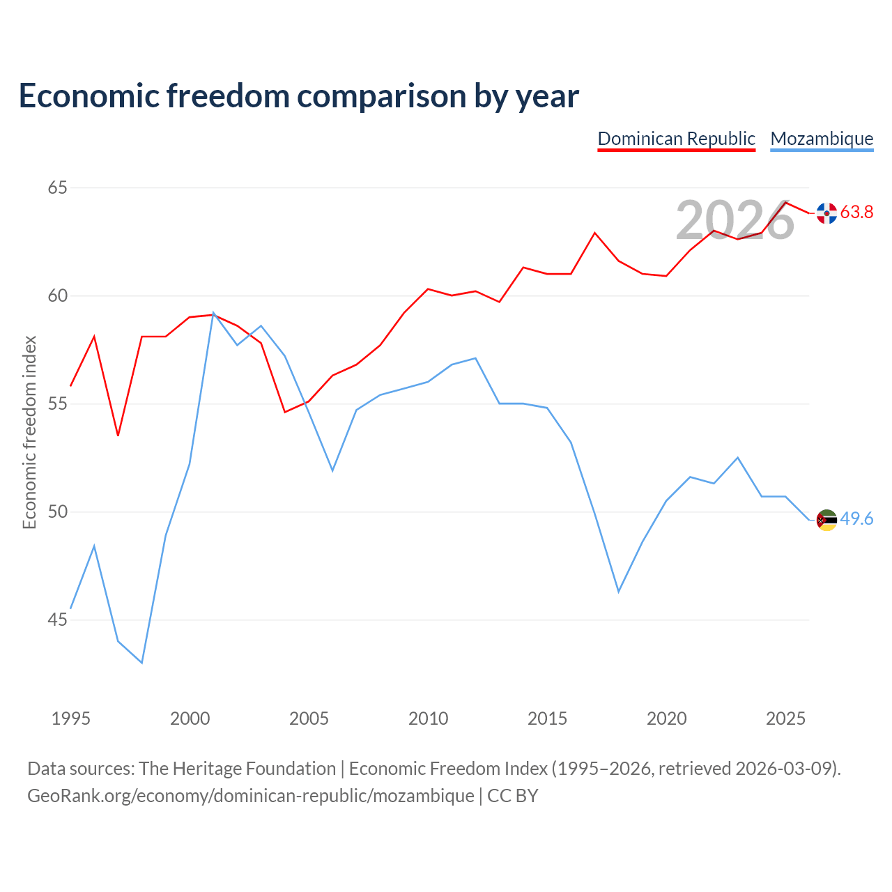 The Economic Freedom Index for the Dominican Republic is 63.8, ranking 77/197, compared to 49.6 for Mozambique, ranking 164/197. The chart above displays a comparison of annual changes in economic freedom indexes.