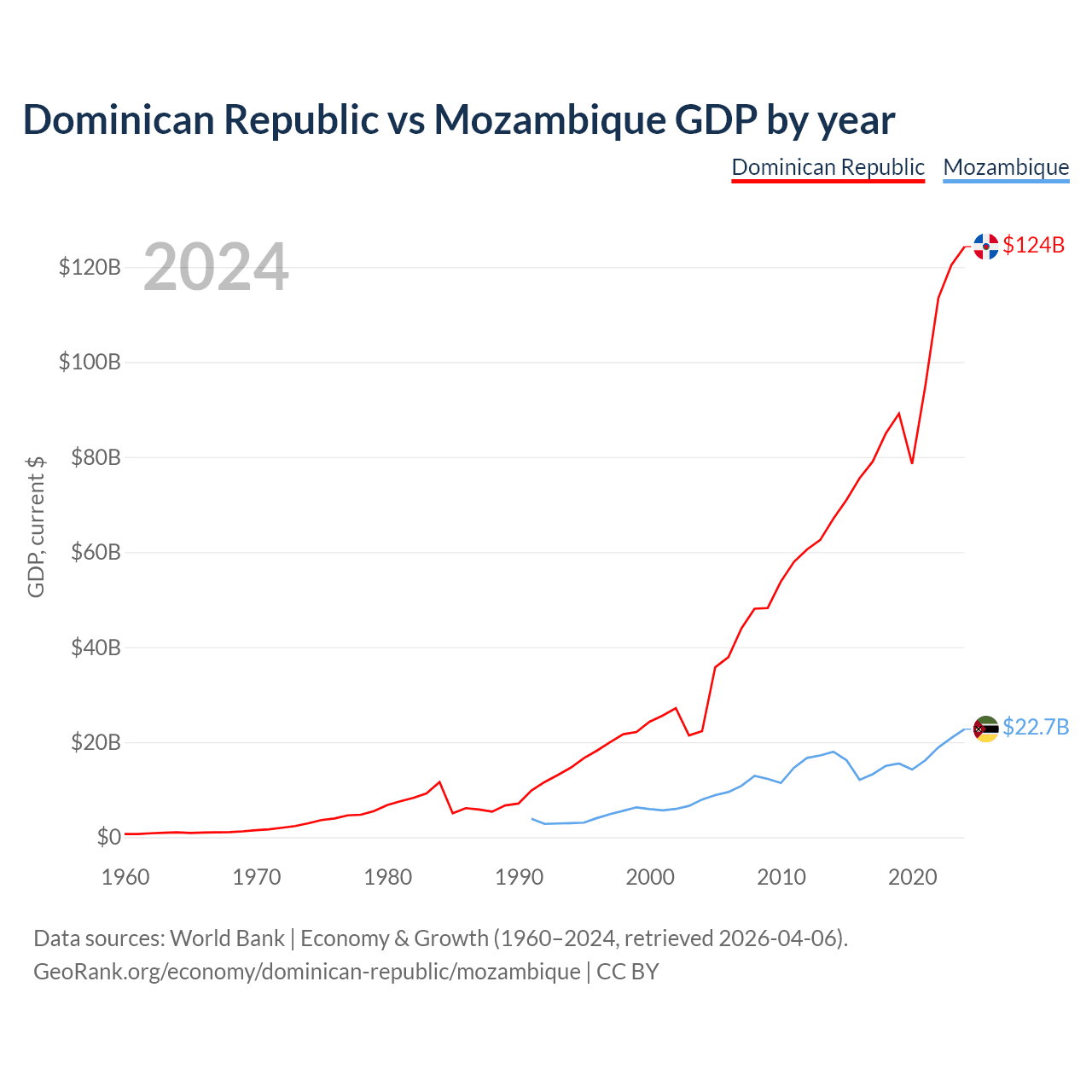 The Dominican Republic has a GDP of $124B compared to $22.7B for Mozambique, ranking 63/197 and 123/197 by economy size, respectively.
