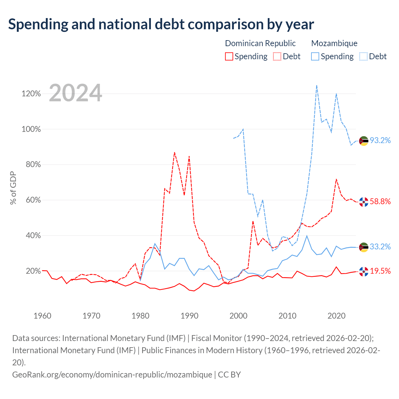 The Dominican Republic has $73.1B in government debt (58.8% of GDP), compared to $21.2B (93.2% of GDP) in Mozambique.