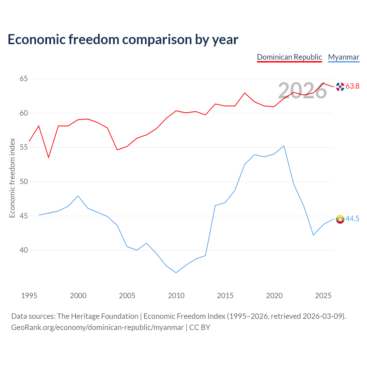 The Economic Freedom Index for the Dominican Republic is 63.8, ranking 77/197, compared to 44.5 for Myanmar, ranking 180/197. The chart above displays a comparison of annual changes in economic freedom indexes.